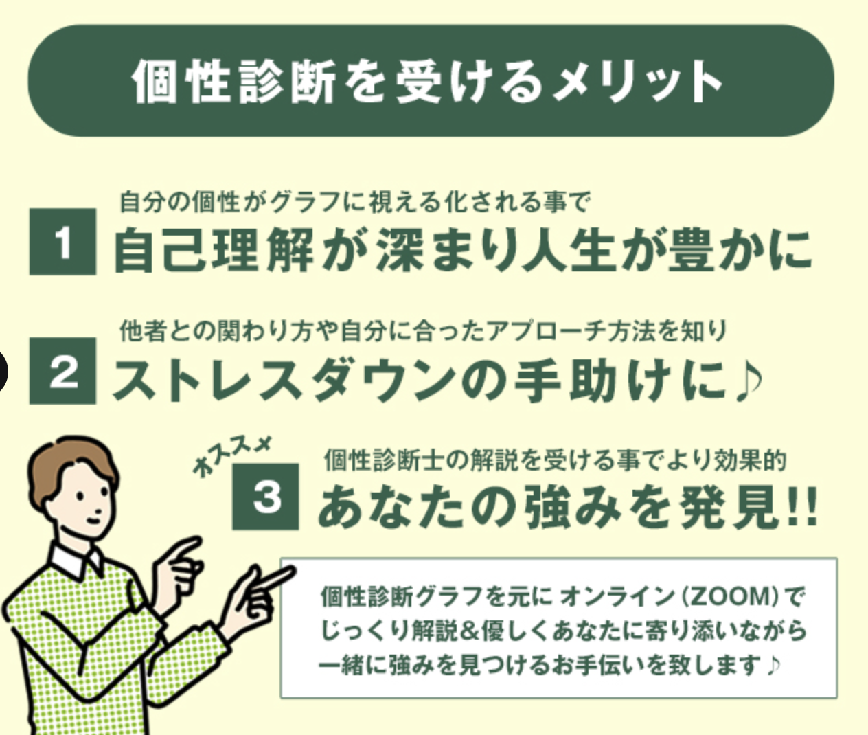 自分の個性の特徴や、好き。苦手、強みが知る事が出来るのに加え