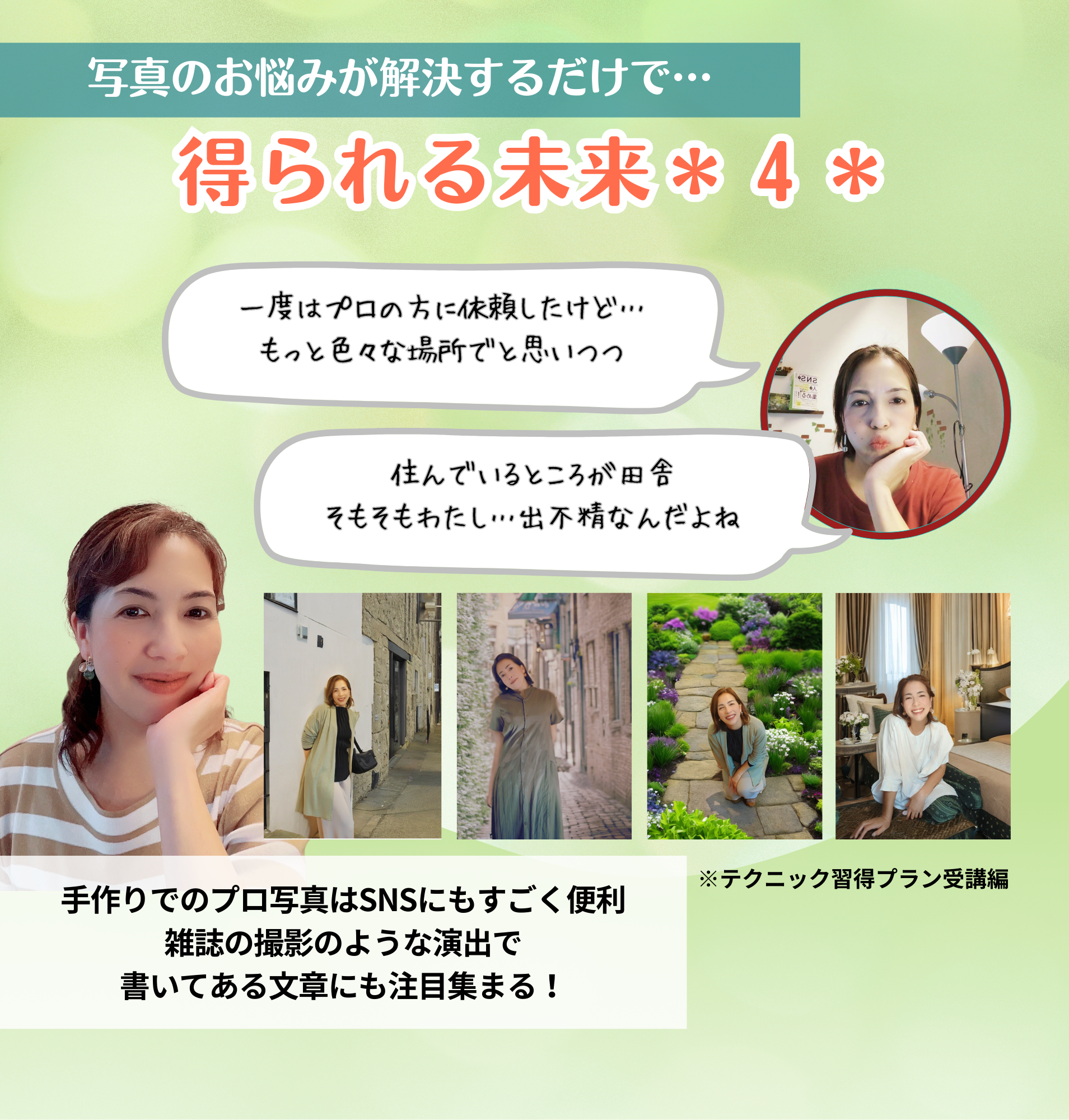 「住まいがすごく田舎。何度かプロに依頼したけどもう写真は前のもの。でも毎回都会に出るの実は大変で…」と言っていたKさん