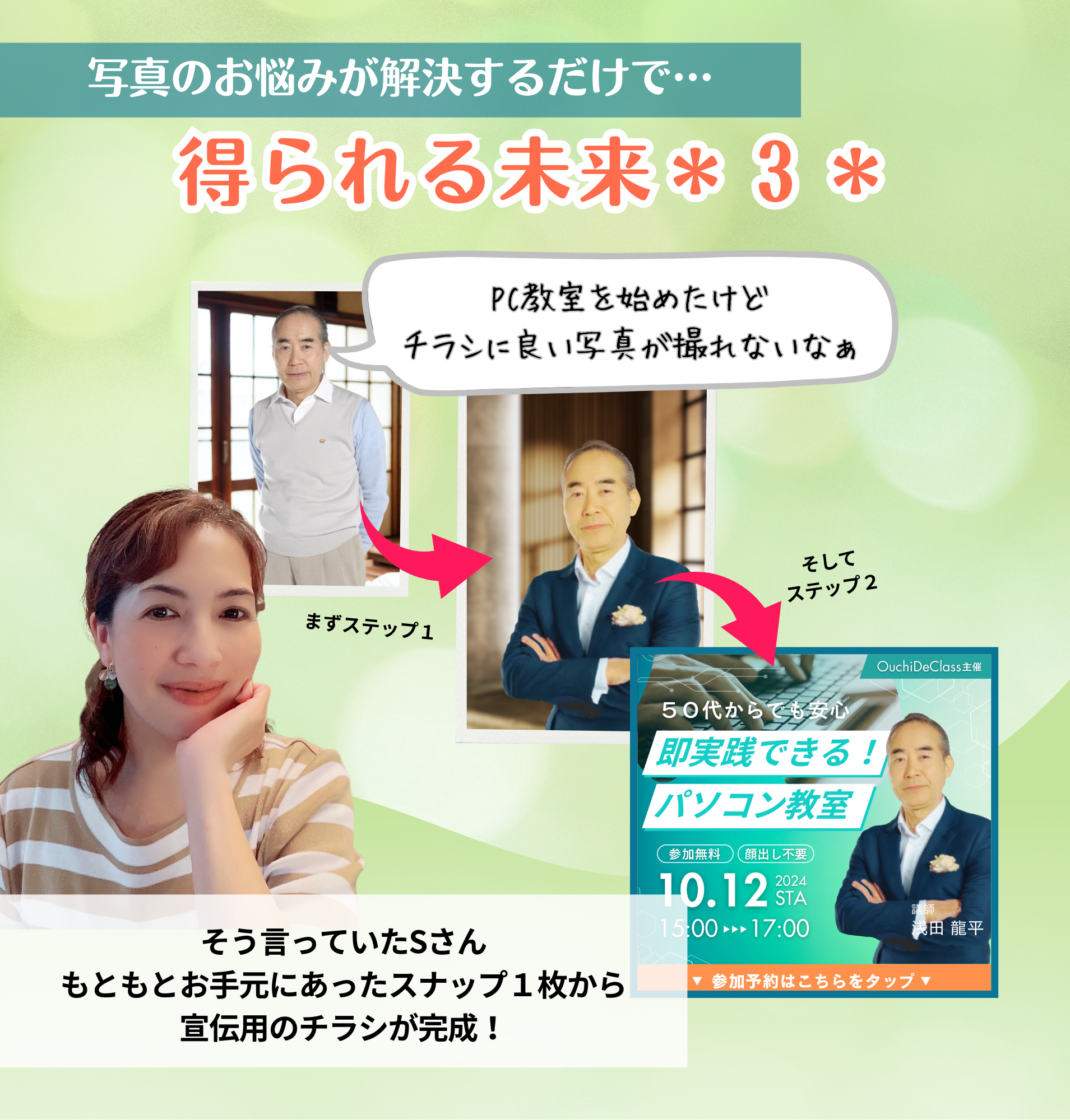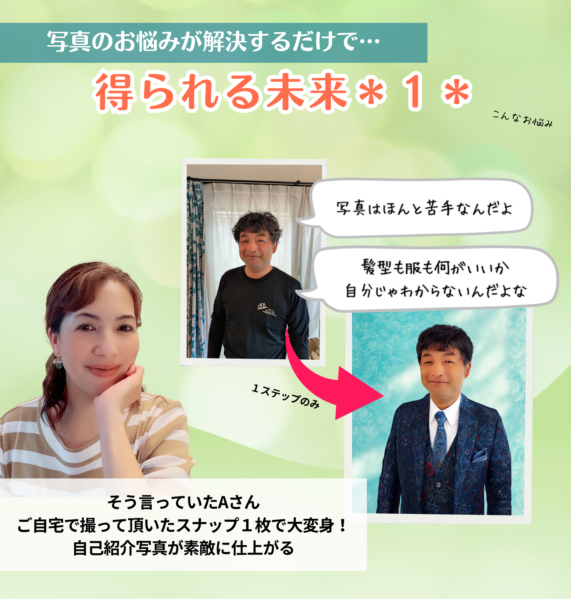 ⇒ご自宅で撮って頂いたスナップ1枚で大変身!自己紹介写真が素敵に仕上がり「これ、俺?」と喜ばれていました。