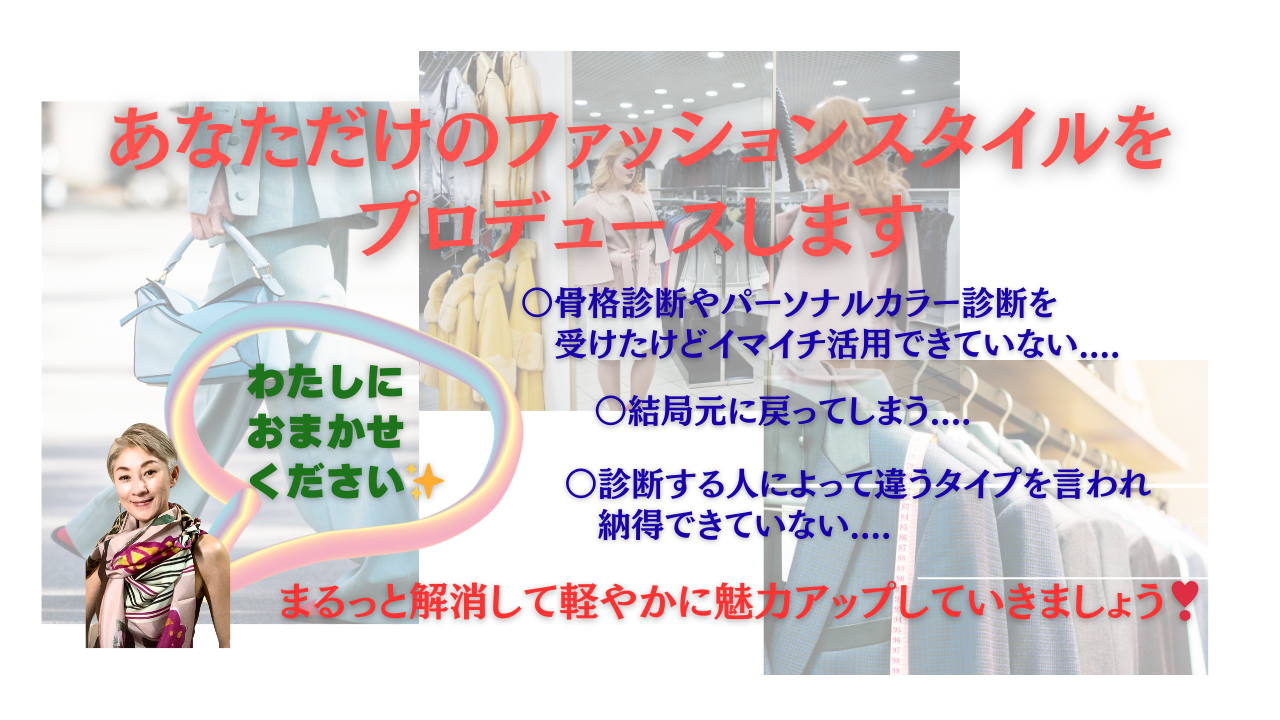 骨格診断、バースカラー診断、似合う色、カラーセラピーなどからその方に合わせた方法でファッションスタイルを導き出します。