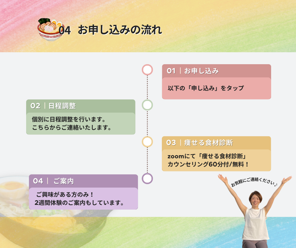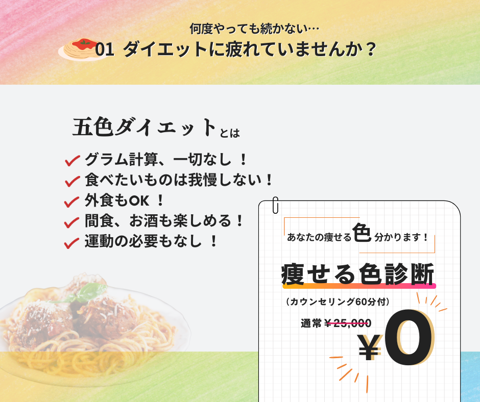 今回は、60~90分のカウンセリングで、すでに身体や心にでているサインをお聞きしながら、あなたのダイエットや健康を妨げている色(食材)を診断しちゃいます。
