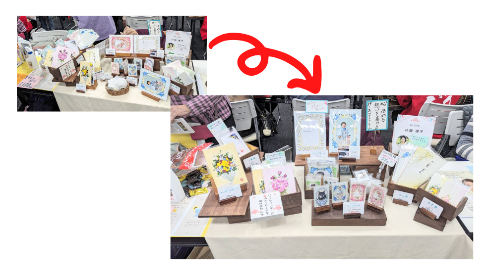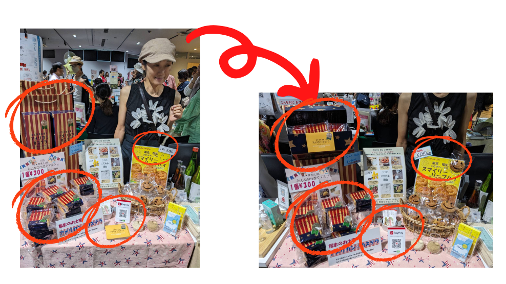 中西さんのアドバイスを受けさせていただいて、私がいかに自分主体で全ての陳列を行っていたかに気付かされました。 そこから、お客さんの視点に立って、どうしたら興味が湧くか、買いたくなるかの工夫を簡単なポイントに落とし込んで教えてくださいました。