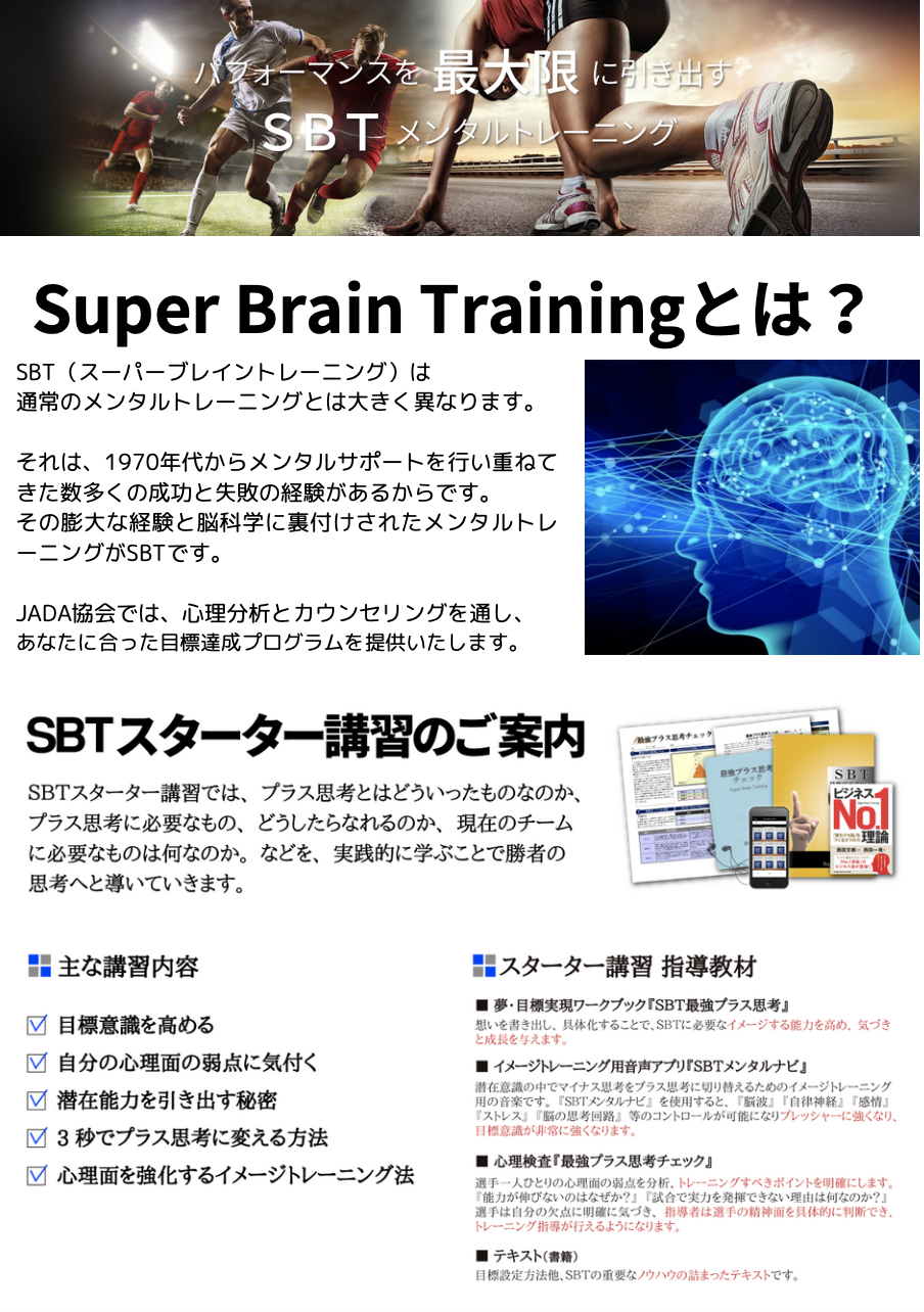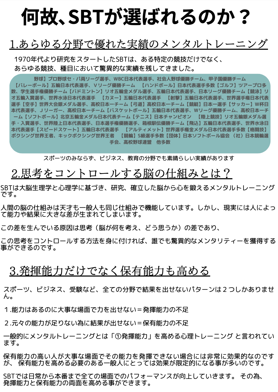 SBTは、スポーツ、受験、ビジネス、日常の人間関係など、さまざまな場面で前向きに挑戦し、目標に向かって進むための「心の土台づくり」をサポートします。