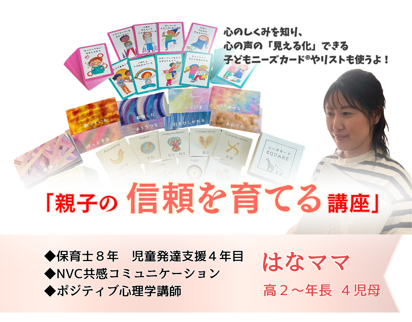 ポジティブ心理学・共感コミュニケーション・児童発達支援等の経験をベースに、動画教材・カードセッション、開講中。