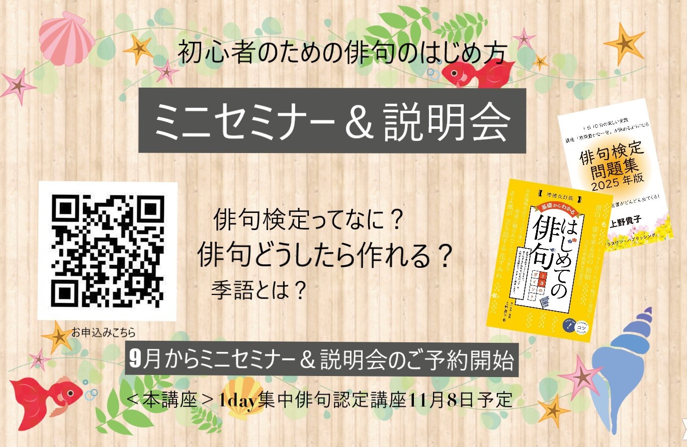 俳句検定講座に向けてのミニセミナーです。初めての方でもこれから俳句をやってみたいという方でも気軽に参加して頂けます。