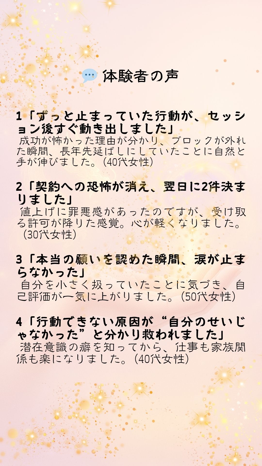 成功が怖かった理由が分かり、ブロックが外れた瞬間、長年先延ばしにしていたことに自然と手が伸びました。(40代女性)
