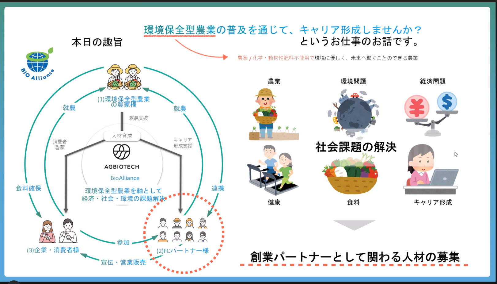 農家さんの収益改善はもちろんのこと。FCパートナー(マーケター)の収益化、ユーザーへの身体に良い農作物の提供と環境保全理解の啓蒙など、農業を通した経済価値と社会的価値を向上し次世代に繋げていくプロジェクトです。