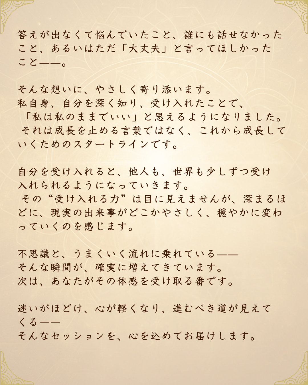 “本当はどうしたい?”という魂の声を、いっしょに見つけていく時間です。