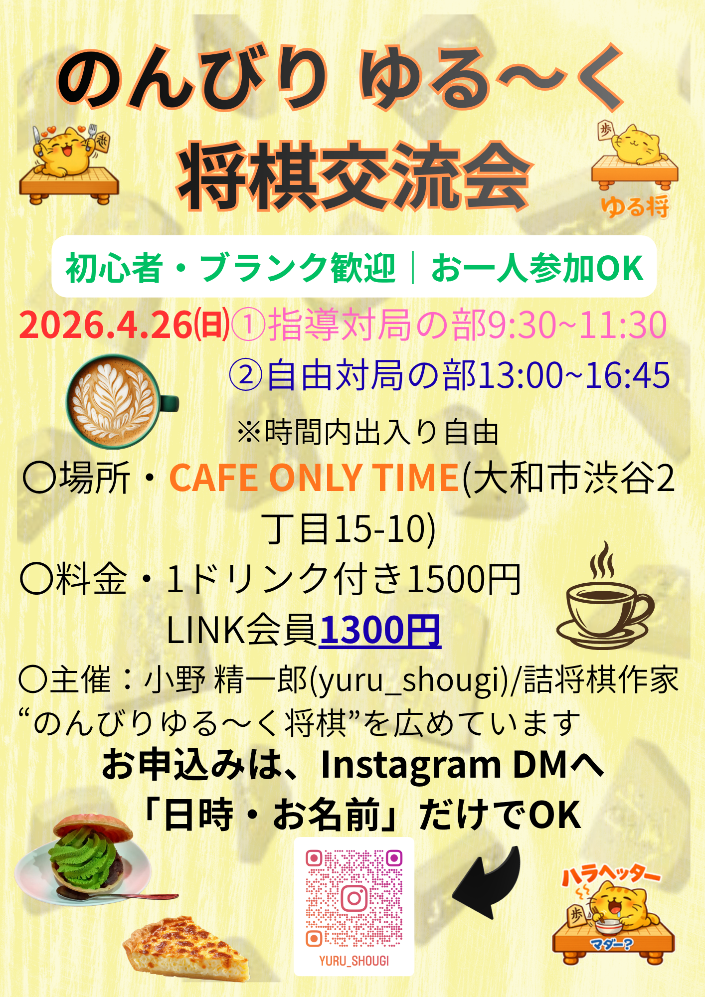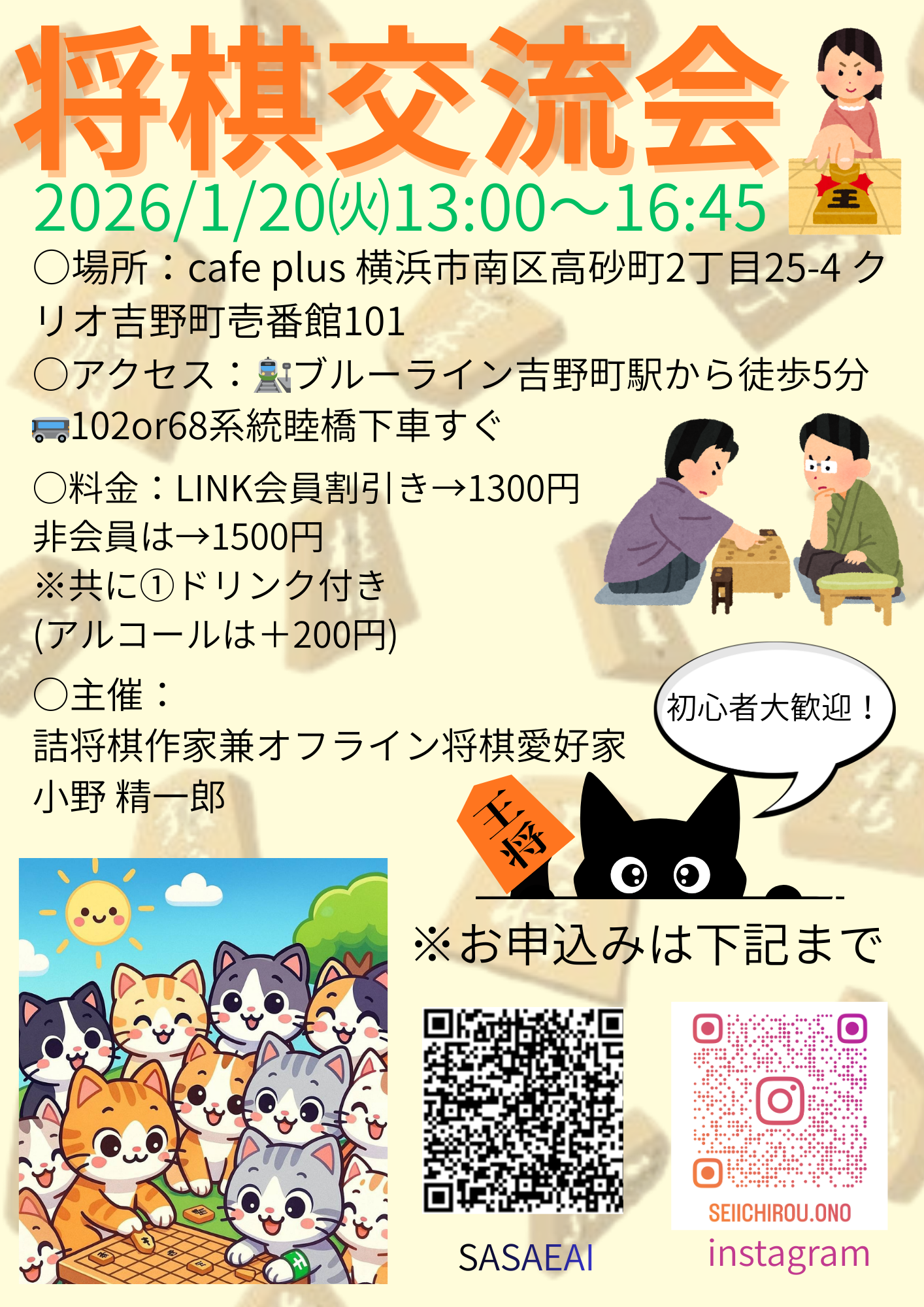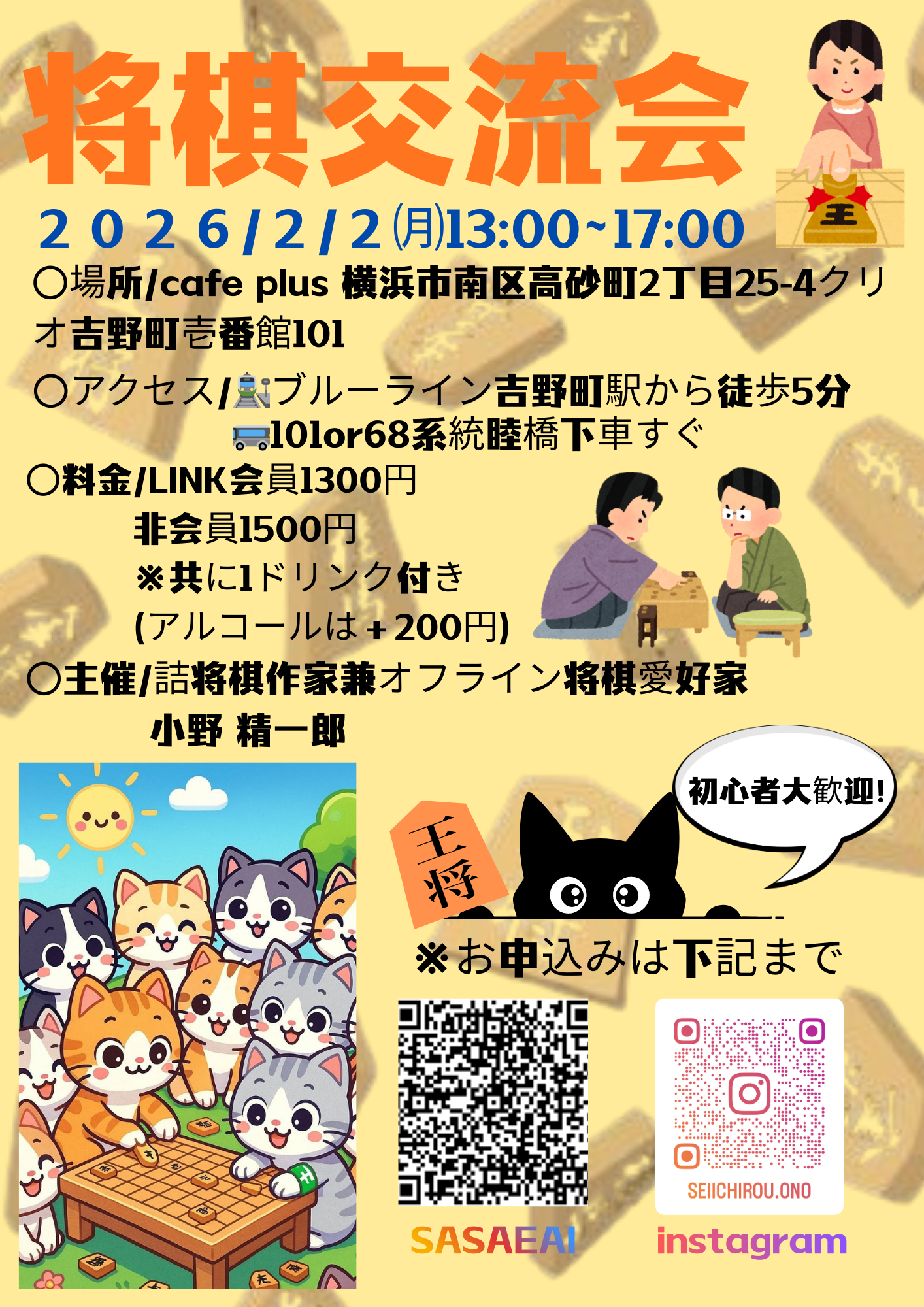 参加者同士の自由対局、主催者による指導対局、主催持参のPC及びタブレットによる詰将棋問題閲覧(主催者創作)&局面解析。※会場のカフェ等で飲食可能。