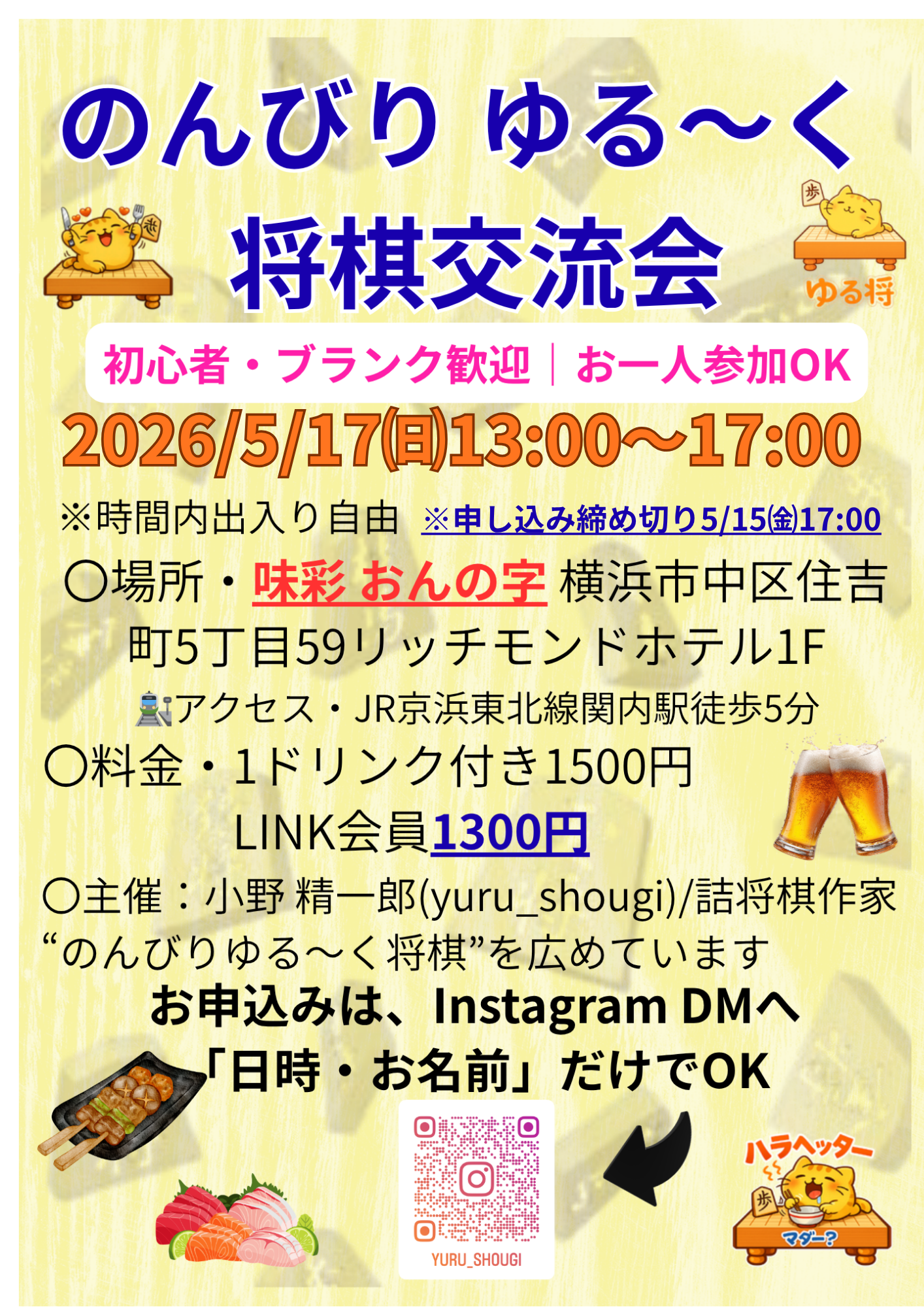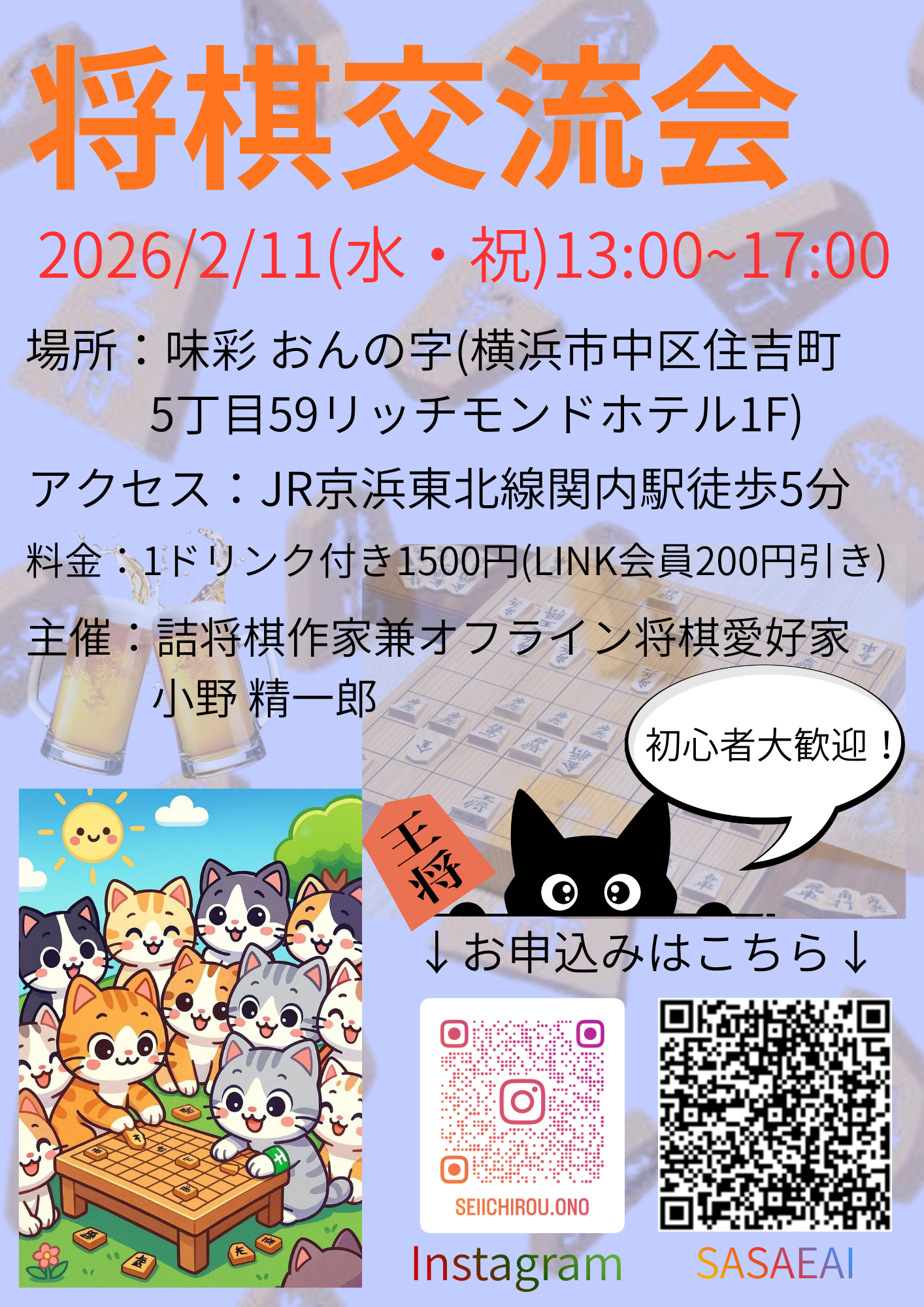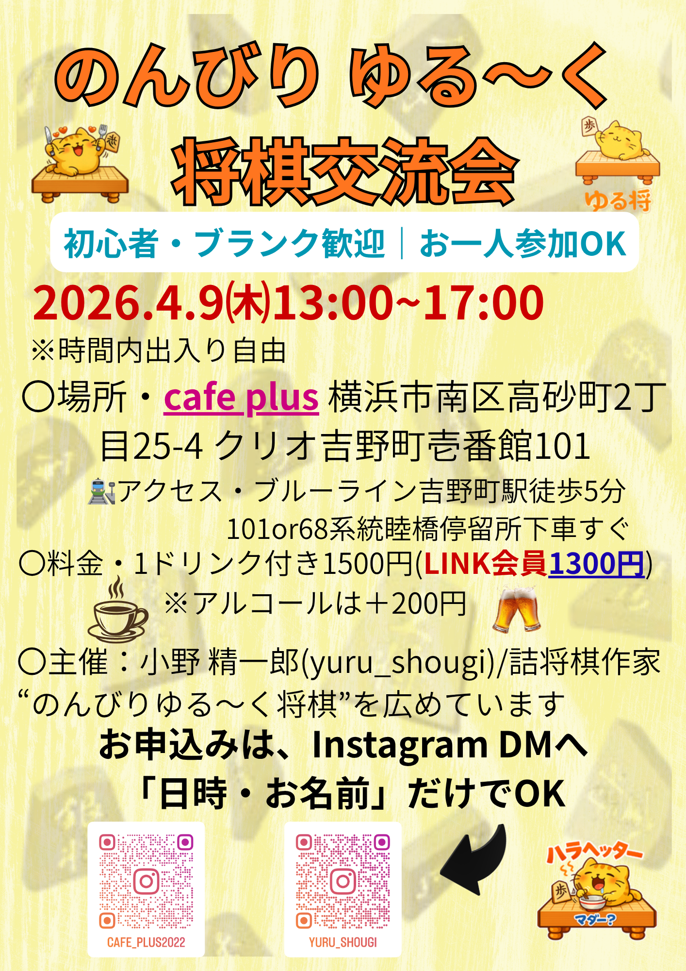 参加者同士の自由対局、主催者による指導対局、主催持参のPC及びタブレットによる詰将棋問題閲覧(主催者創作)&局面解析。※会場のカフェ等で飲食可能。