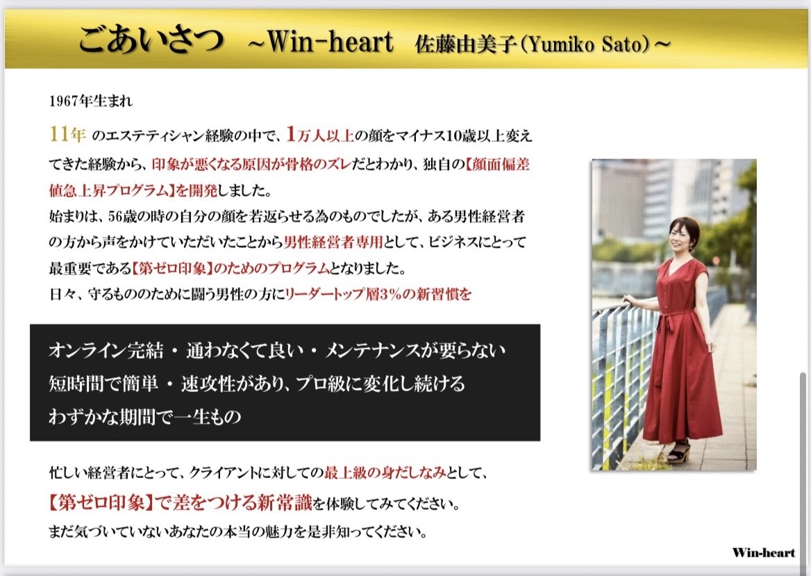 11年のエステ経験から生まれた独自の「骨格整形メソッド」である【顔面偏差値急上昇プログラム】を使い、オンライン講習4ヶ月で男性経営者の顔を“戦略的に”進化させるコンサルをしています。