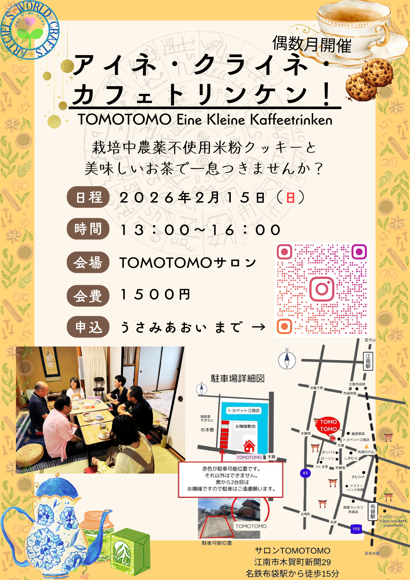偶数月だいたい第二土曜日、愛知県江南市にありますTOMOTOMOサロンにて、栽培中農薬不使用の米粉を使ったクッキーと、煎茶道師範が選んだお茶を楽しみながらのんびりゆったりする会です☕TRPGやTV・アナログゲームを研究・実践してきた夫セレクトのカードゲーム・ボードゲームも用意しています🎮
