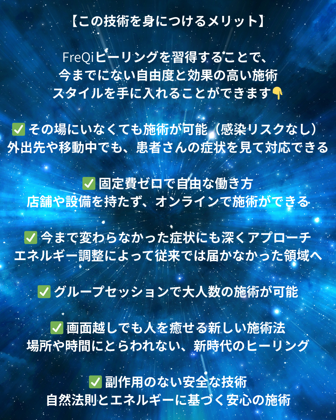 ※オンラインでも、FreQiヒーリング(遠隔ヒーリング)を教えています。