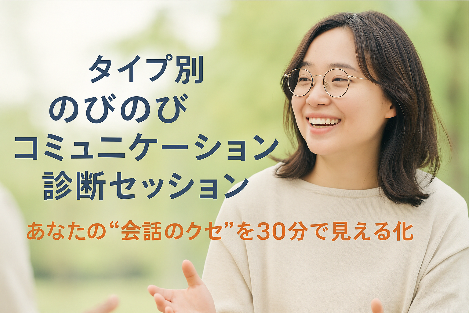 Zoomで30分間、質問と対話を通してあなたの会話タイプを診断。タイプごとの「のびのび関わるヒント」をその場でお伝えします。
