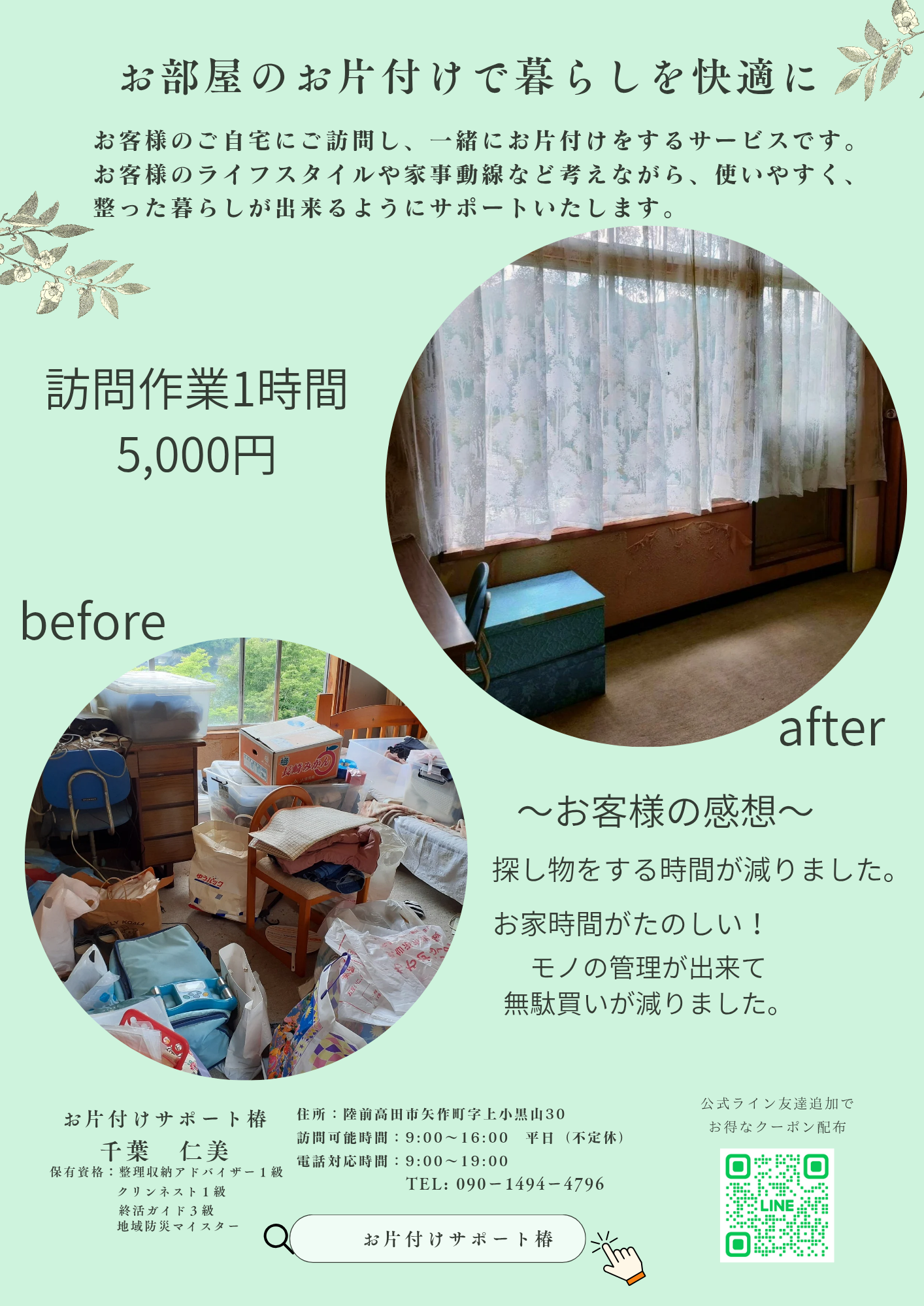 お片付けで人生が変わった私だから出来るサポート。
