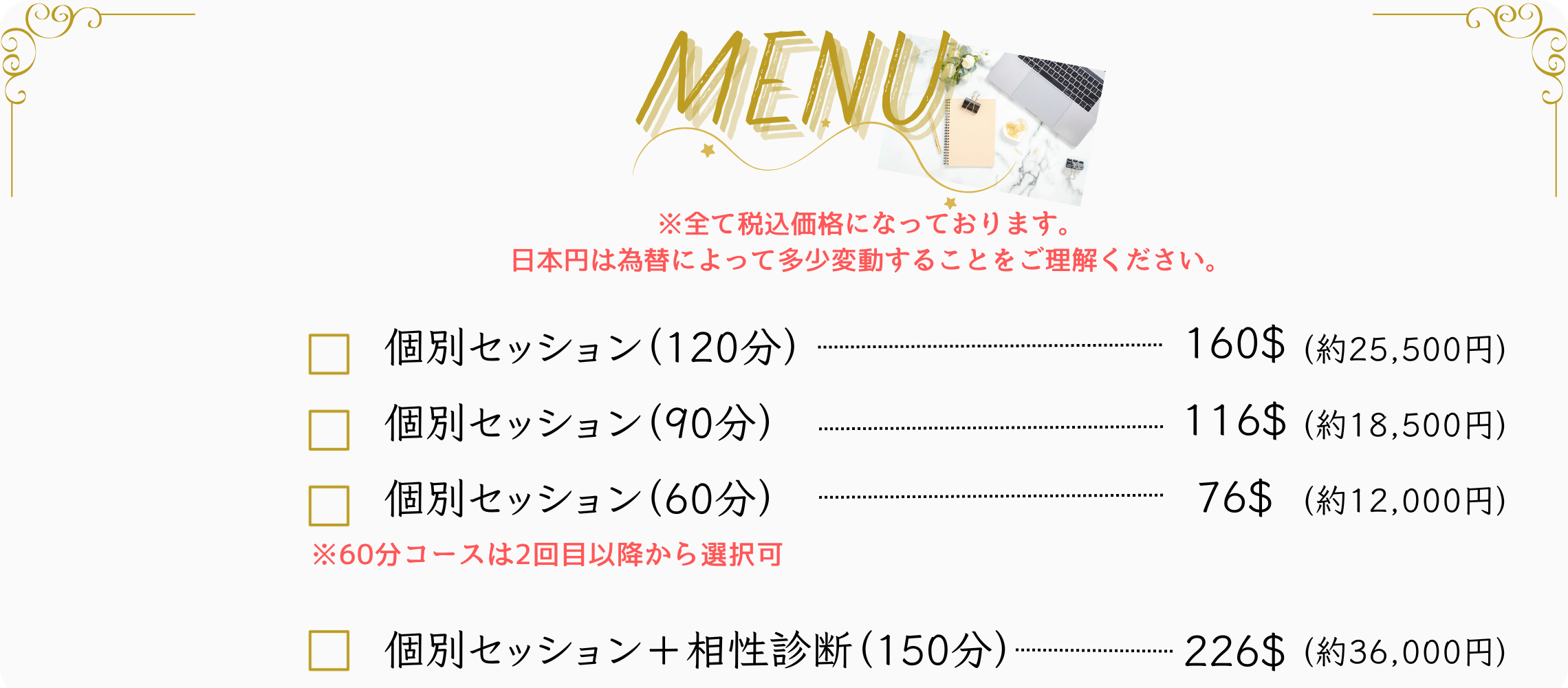 ♦️個別鑑定+相性診断150分:136ドル(約20,000円)