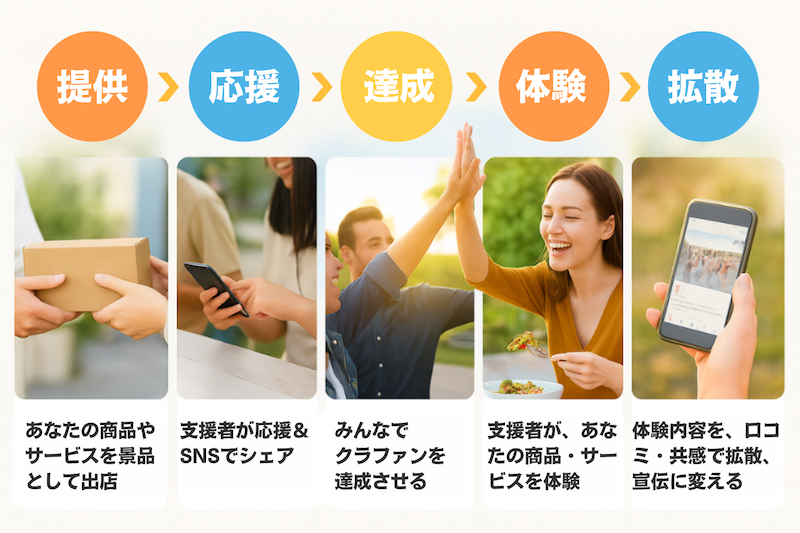 あなたの商品やサービスを“景品”として出品することで、支援者が体験し、SNSや口コミで拡散してくれます。