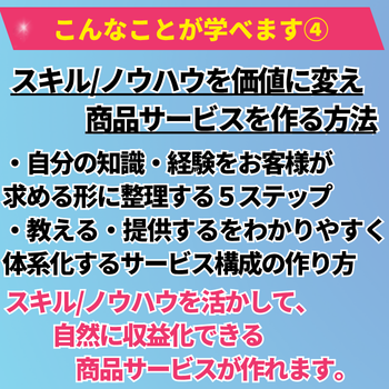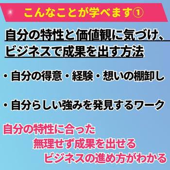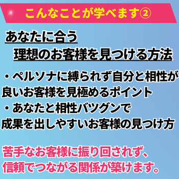 これまでの経験や得意なことを整理し、「自分はどんな形で人の役に立ちやすいのか」を見つけていきます。さらに、自分の想いや価値観に共感してくれる「あなたに合うターゲット像を明確にします。