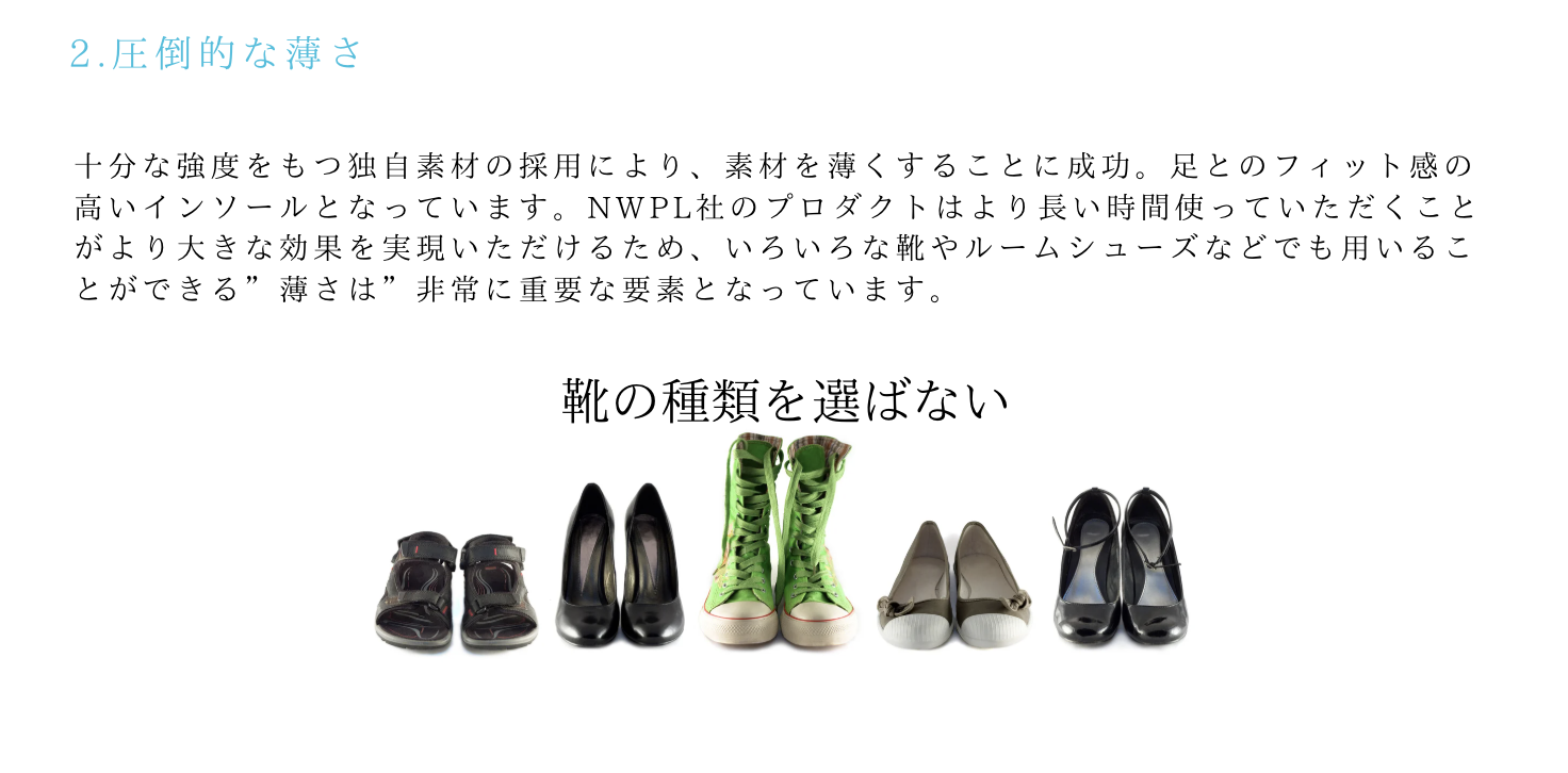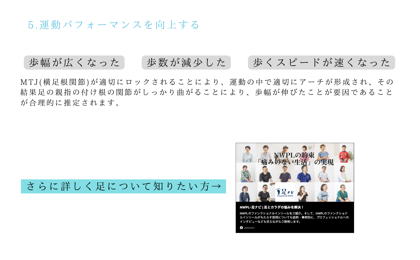 → 足のアーチを正しく支えることで、全身の負担を軽減。