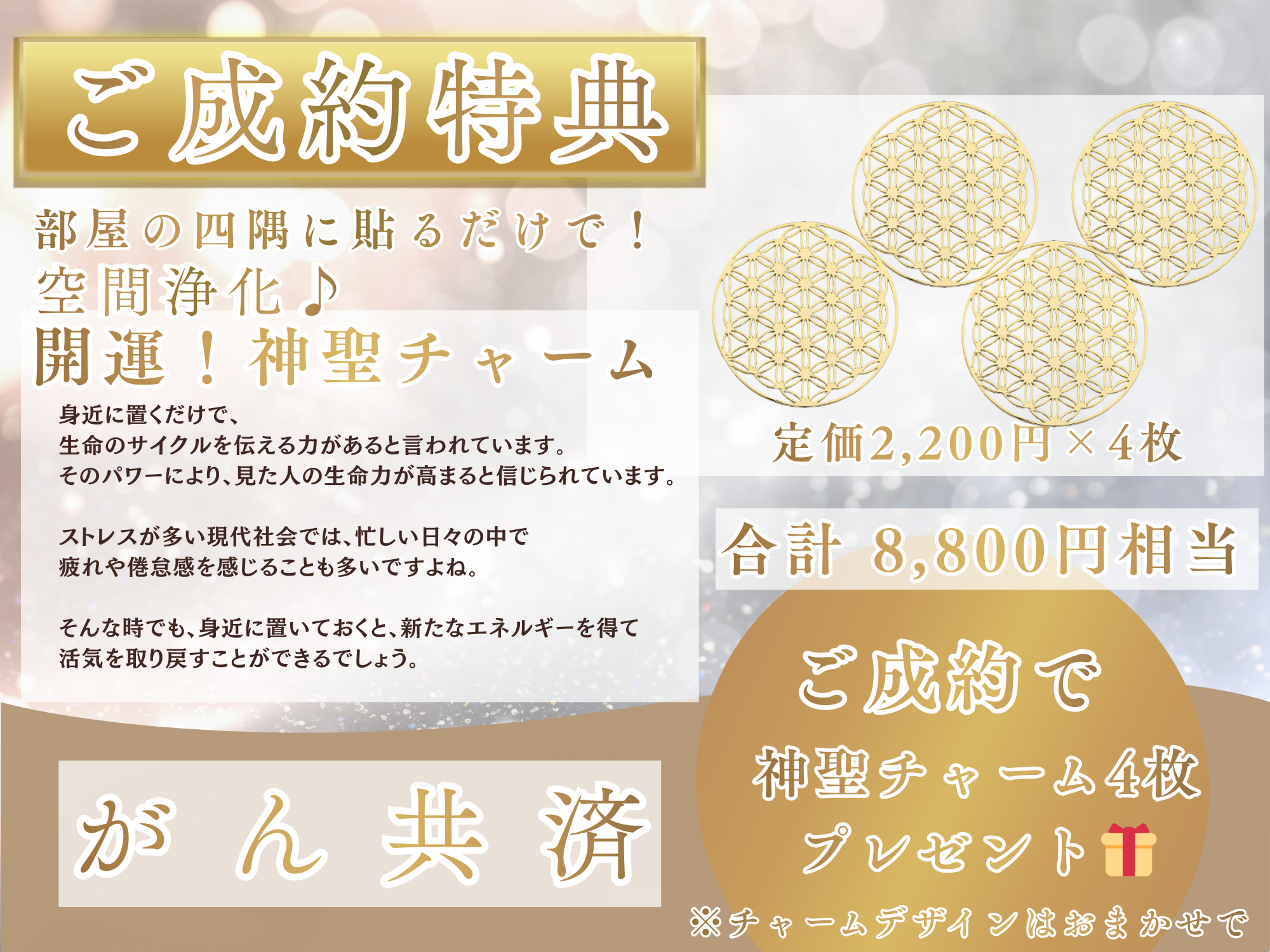 ・公式LINEにご登録頂き、後日zoomで無料相談&がん共済説明後ご成約で、開運チャーム ¥8,800相当をプレゼント🎁・お部屋の四隅に貼ることで居心地の良いお部屋に大変身♪