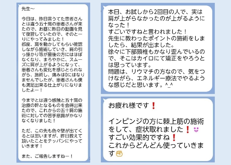 今までとは違う感触と五十肩施術の幹となるものを会得できたので、これから五十肩の施術に対して苦手意識がかなりなくなりました!