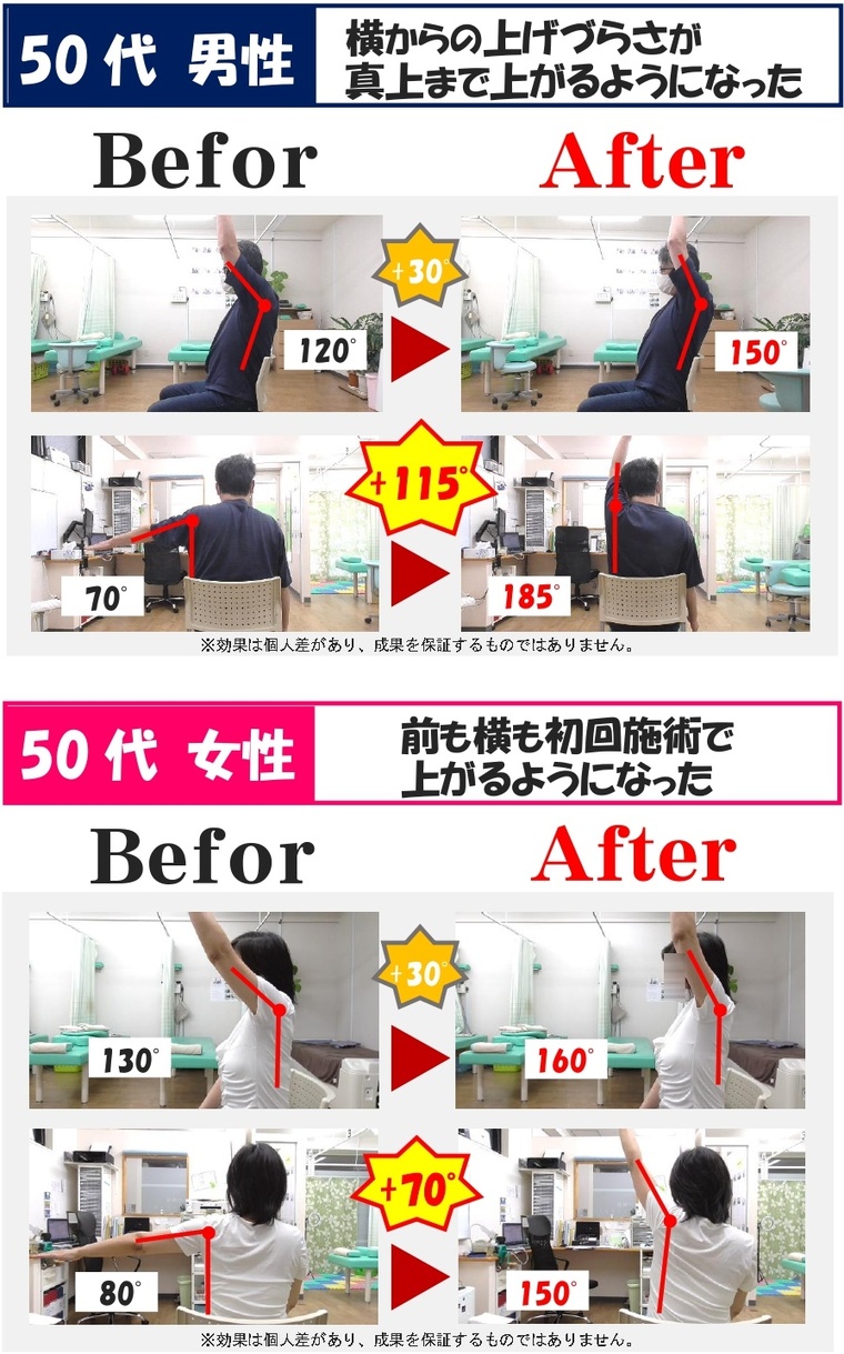 お試しから2回目で肩が上がらなかったのが上がるようになった!すごいですね!と言われました!先生に教わったポイントの施術をしましたら結果が出ました。