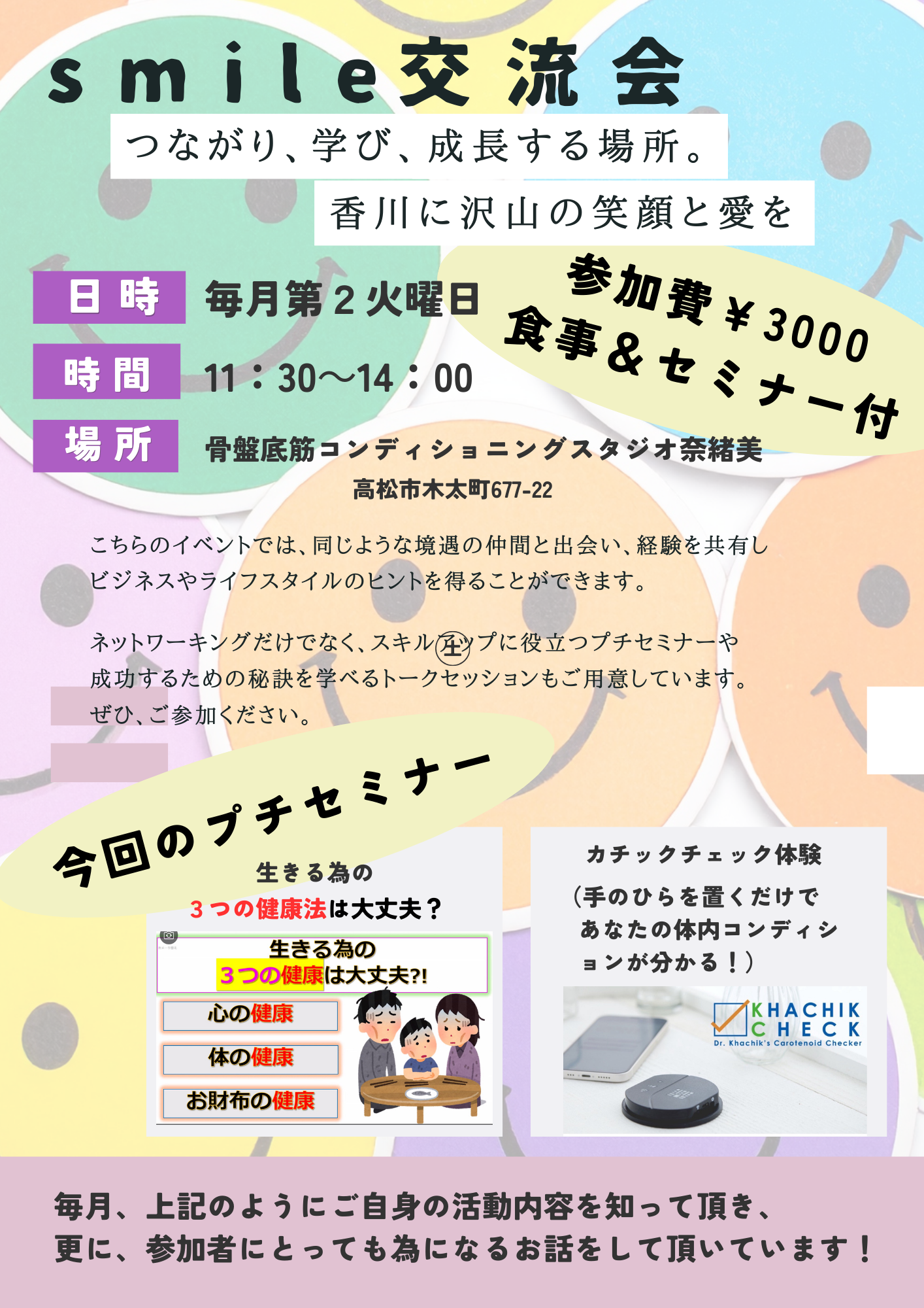 ・SMILE交流会→毎月第2金曜日11時半~14時(老若男女問わず参加OK。主に企業家様・自営業者様・これから事業スタートを御検討中の方