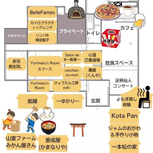 ②一本松の家(はちみつ、みつろう製品販売)①さる山のかしや(お餅、ピザの販売)