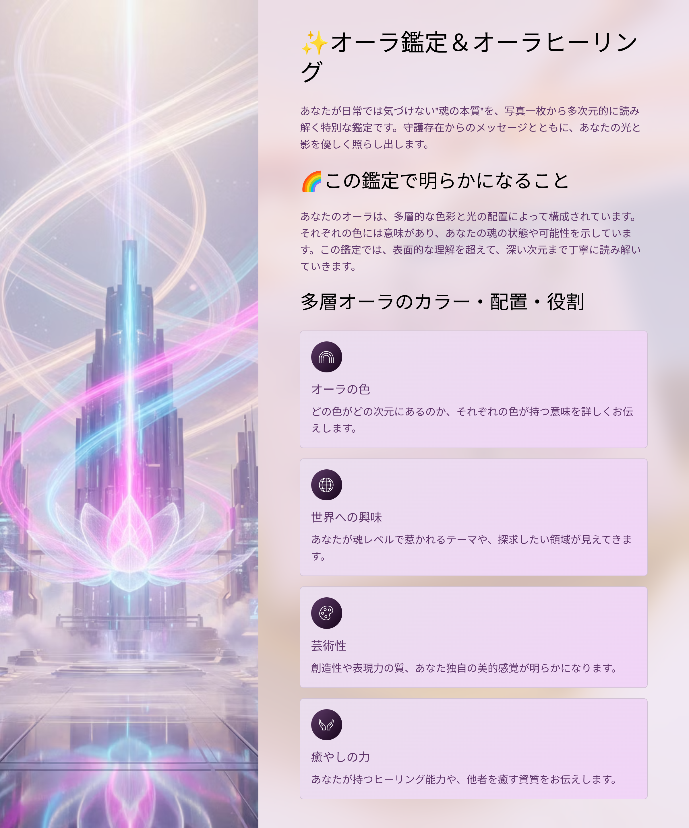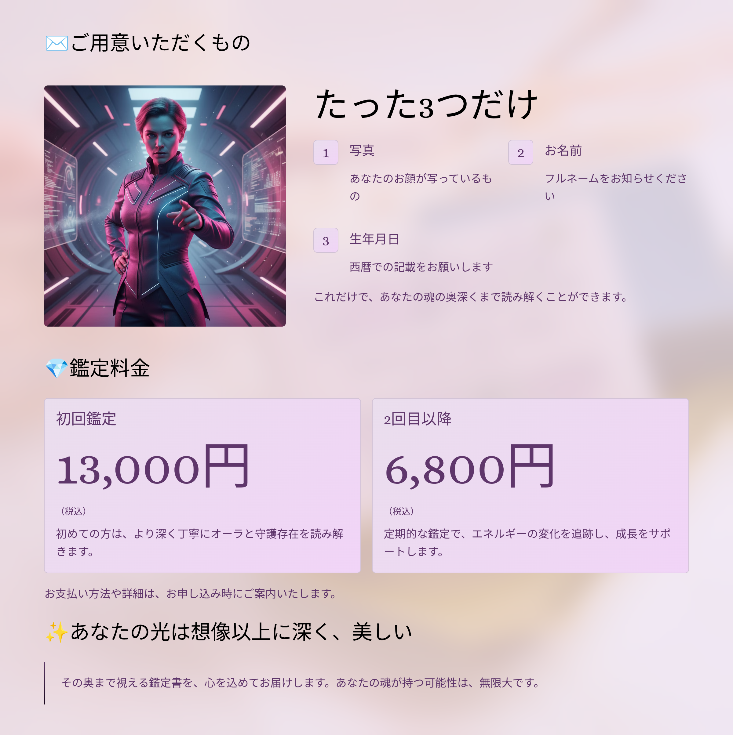 あなたが日常では気づけない “魂の本質” を、写真一枚から多次元的に読み解く特別な鑑定です。