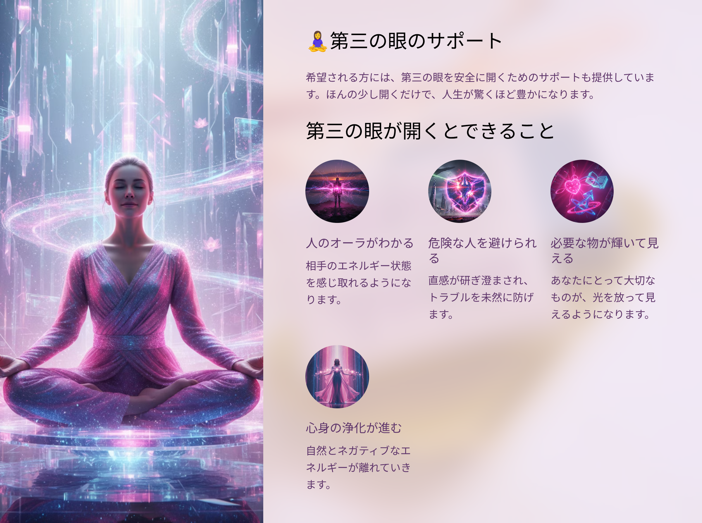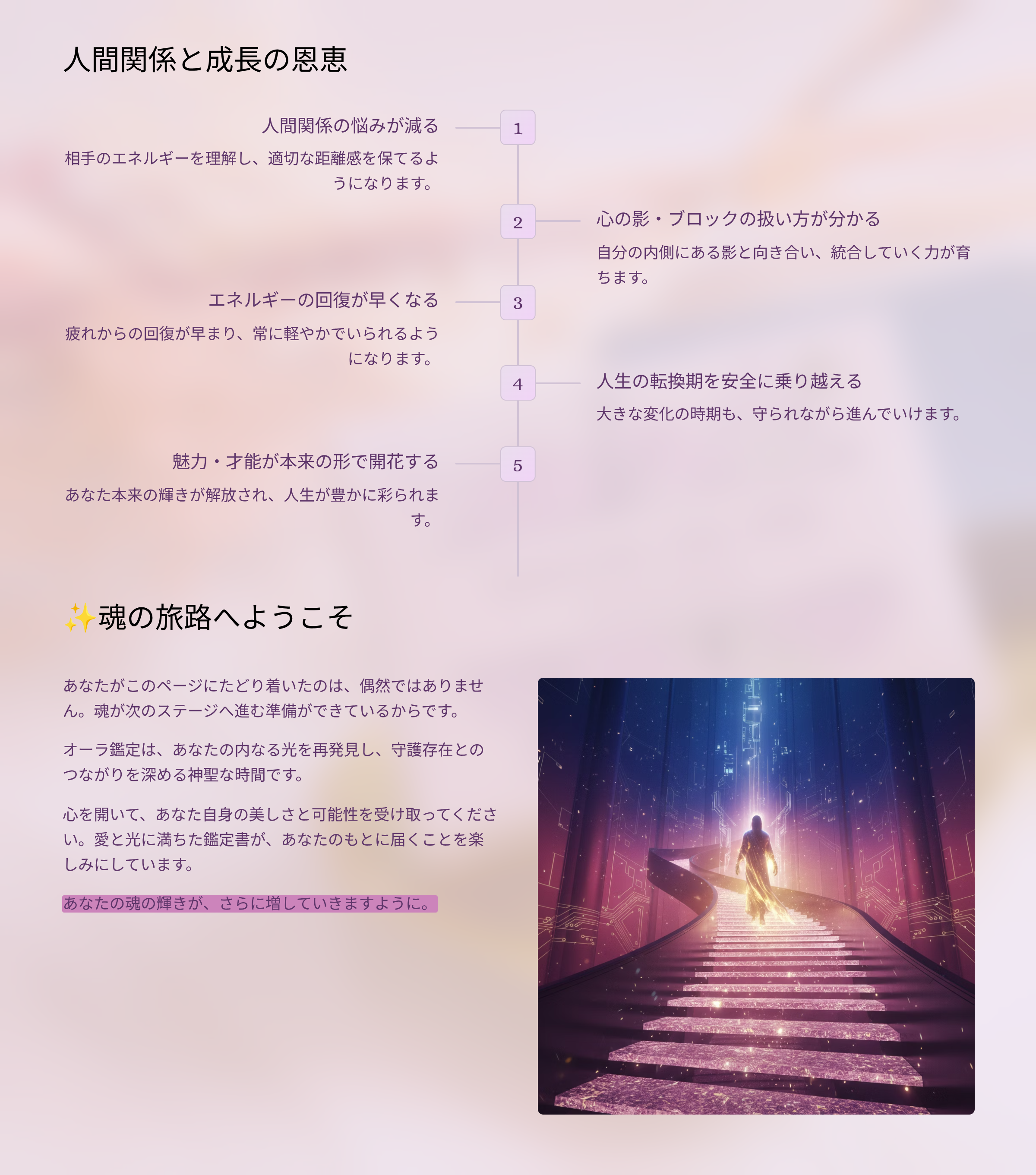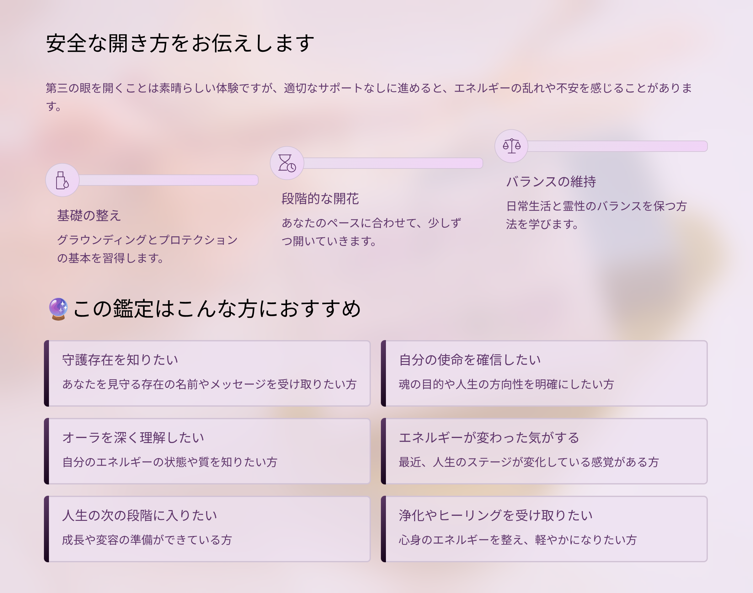 オーラから「開きやすさ」「安全な開き方」を読み取り、必要なアドバイスを添えます。