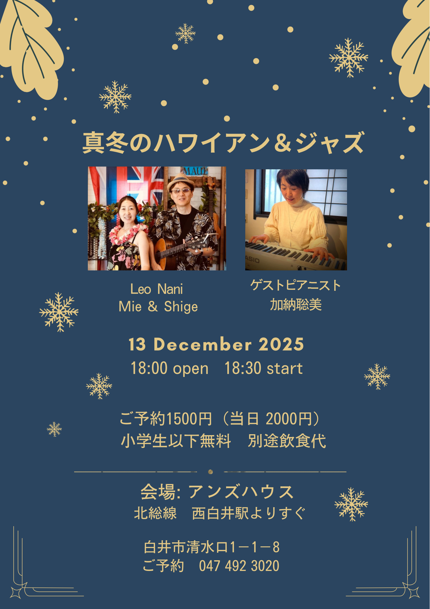 Leo Nani2人のハーモニーとゲストピアニストのかのりんの化学反応をお楽しみに