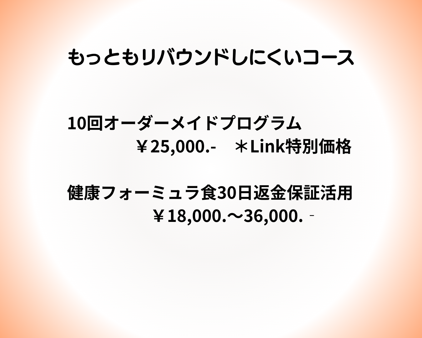 ◇もっともリバウンドしにくいコース 10回オーダーメイドプログラム¥25,000.+ 健康フォーミュラ食¥18,000~¥36,000.