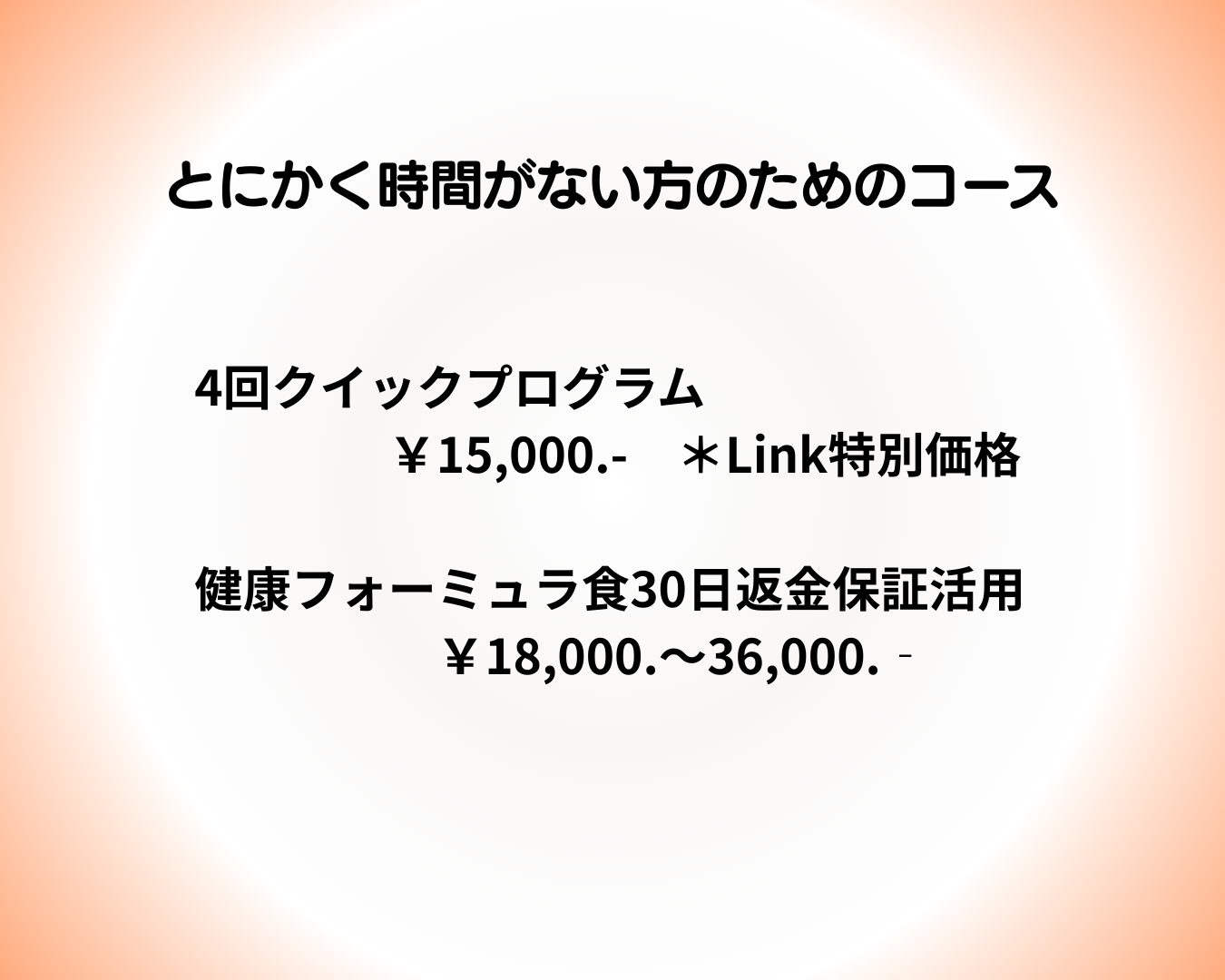 ◇とにかく時間がない方のためのコース 4回クイックプログラム¥15,000.+ 健康フォーミュラ食¥18,000~¥36,000.