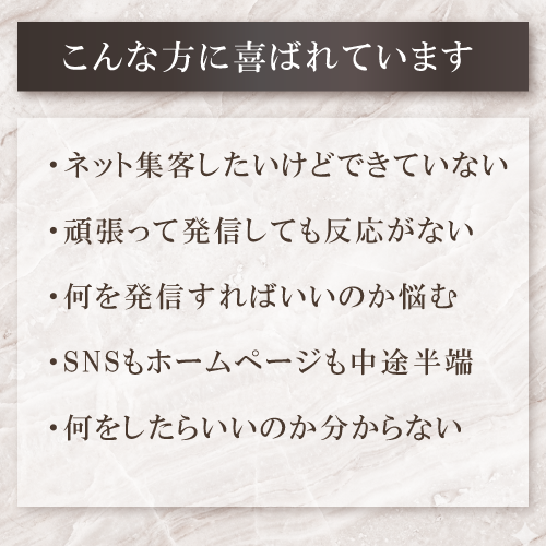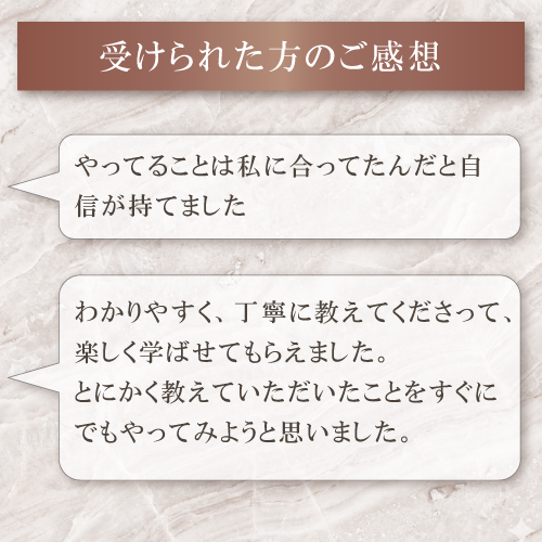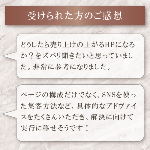 ページの構成だけでなく、SNSを使った集客方法など、具体的なアドヴァイスをたくさんいただき、解決に向けて実行に移せそうです! 商材説明について、お客様目線で作成したつもりでいましたが、まったく目的に沿っていないページだということを思い知りました。