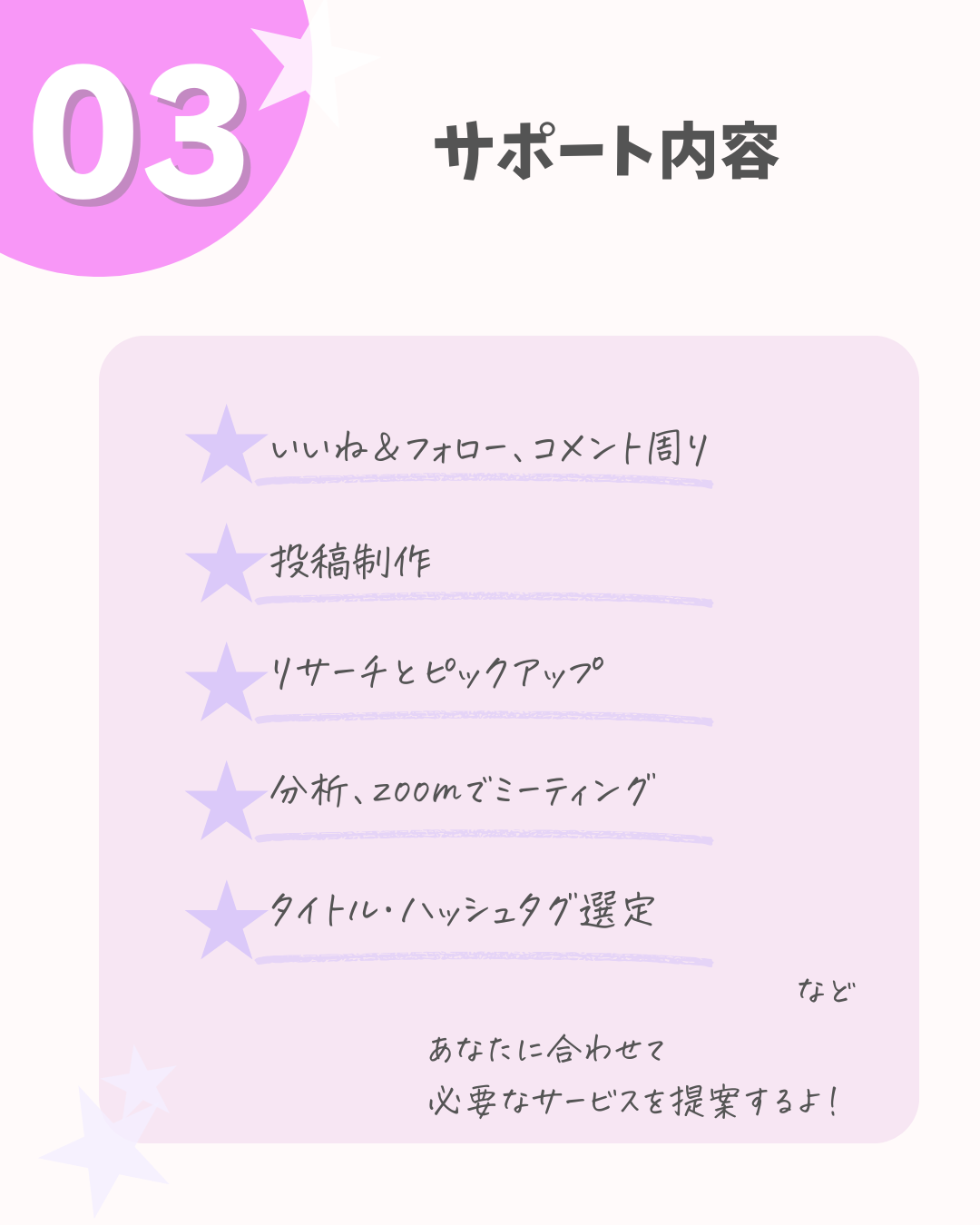 ★お申込み→zoomで状況をヒアリングした後、代行内容など選別してその人にあったプランに組み替えます。
