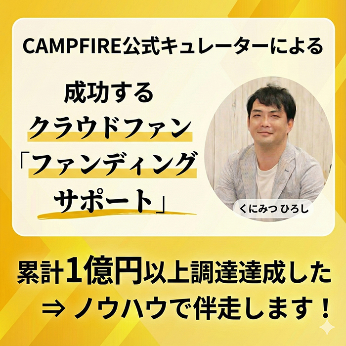 本プランでは、CAMPFIRE公式キュレーターである私(國光洋志)が、企画段階からプロジェクト終了まで、あなたの右腕となって成功へ導きます。