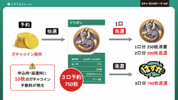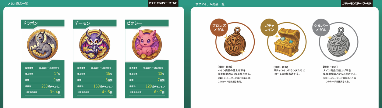 ガチャ・モンスター・ワールドにおける「メダル」は、利用者間で取引される主要なデジタル商品です。利用者様は「ガチャコイン」を使い、メダル購入の予約抽選に参加し、当選することでこれを獲得します。