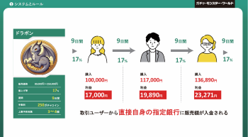 具体的な例として、9日間の保有で17%の利益が得られるサイクルが示されており、100,000円のメダルが117,000円に、さらに117,000円のメダルが136,890円にと、売買が繰り返されるごとに利益が加速する構造となっています。