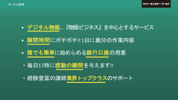 一言で言うと、デジタル商品の「物販ビジネス」をゲーム感覚で楽しめるプラットフォームです。