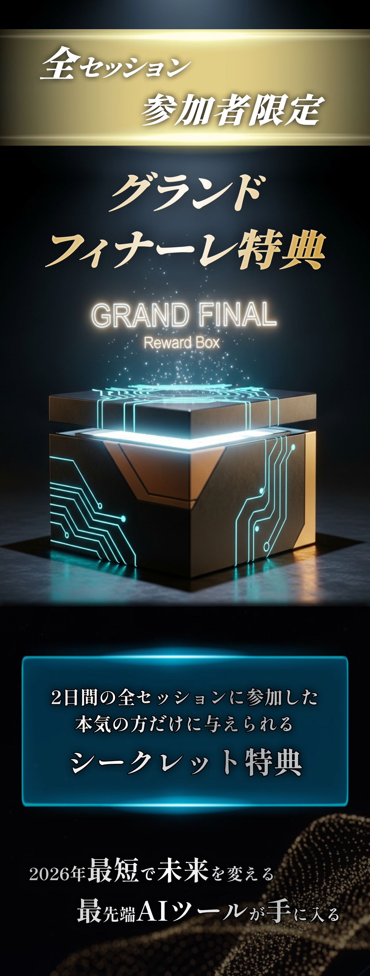 このイベントは、AI業界の成功者たちが集まり、参加者に特典を提供しながら未来のビジネスについて語り合う2日間のセッションです