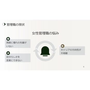 しかし女性管理職の比率が低く、どんな管理職になったらよいかわからない状態です。