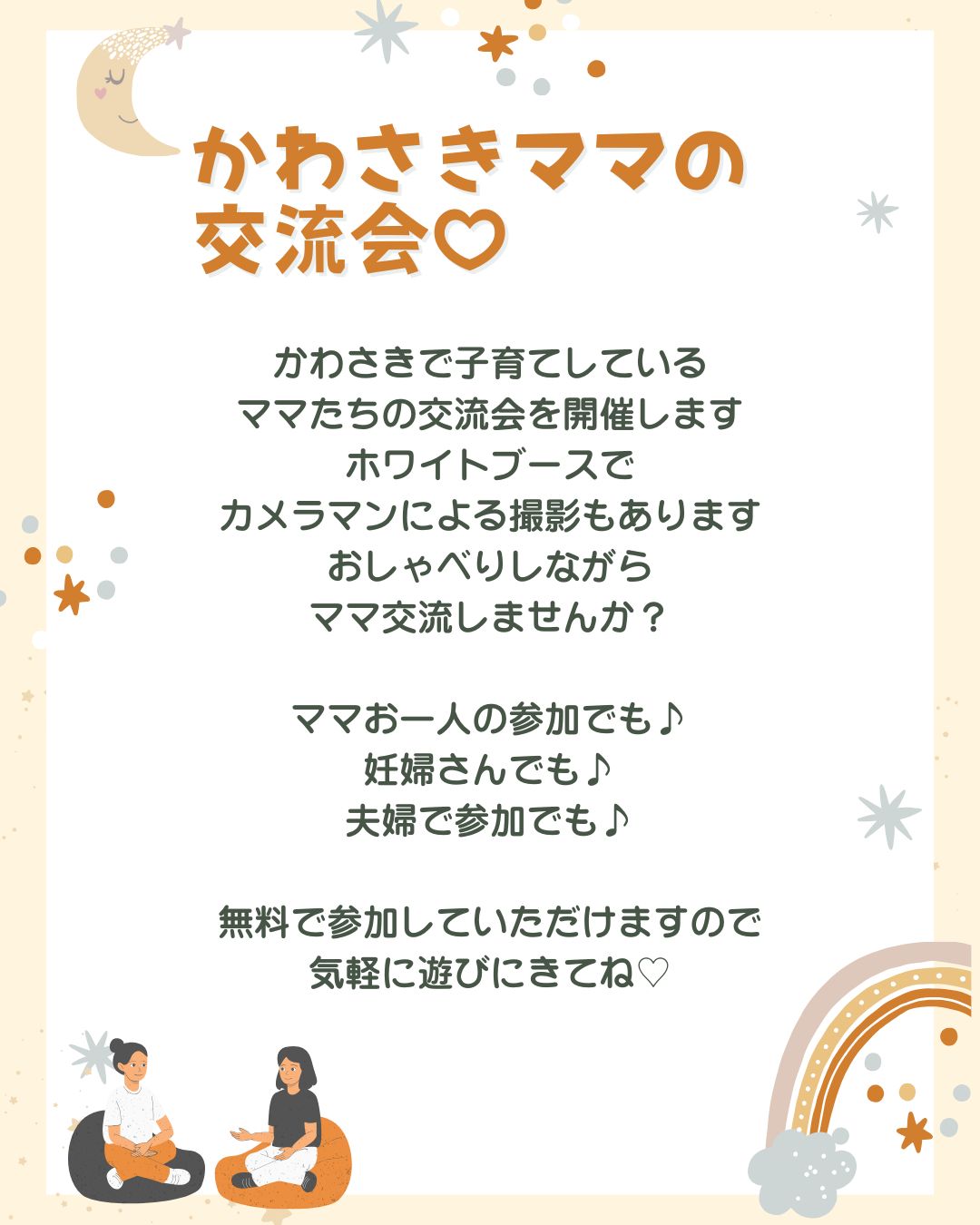 【内容】参加費無料。子育てに関するお悩み相談や、専門家・先輩ママに聞いてみたいこと、わが子自慢などをざっくばらんに話しながら交流します。当日は会場にホワイトブースを設置しますので、プロのママカメラマンによる撮影もあります。(1カットデータプレゼント)