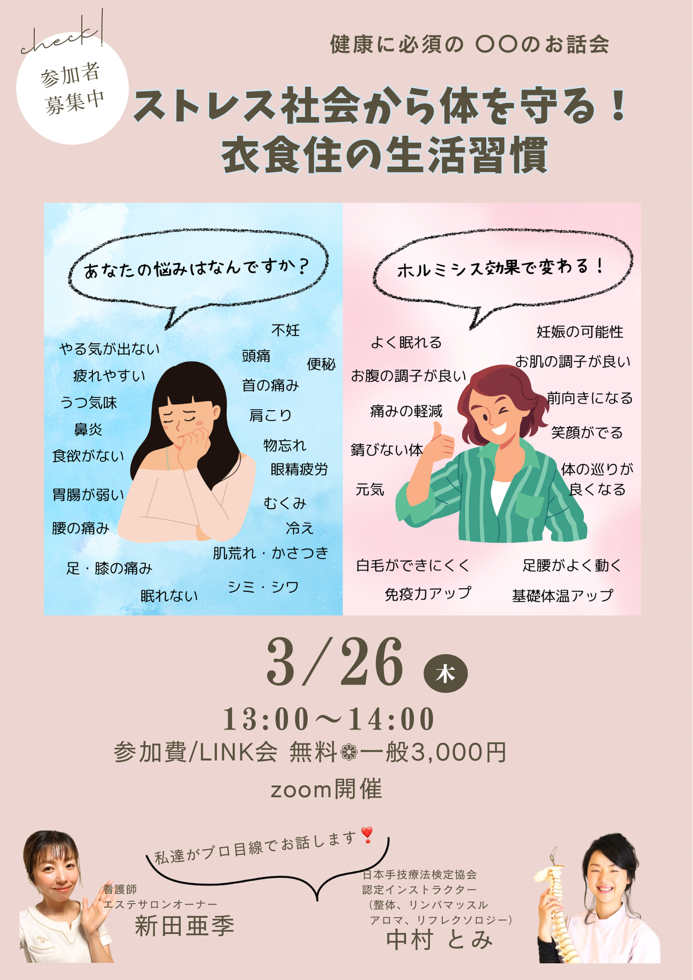 衣食住の生活習慣で未病に対するケアができるってご存知ですか?現代のストレス社会で身体の不調に悩まされてる方が増えてますよね。今の生活習慣を少し変えるだけ♪身体が快適になると生活の質がグレードアップする!生活習慣アドバイザーがストレスから体を守るアドバイスをお伝えします。