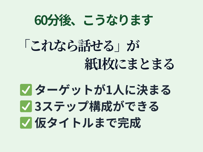 そんな“講座作りの迷子”を、60分で整理して「最初の講座の設計図」を作る体験会です。