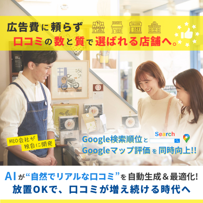 「口コミが増えない」「評価が不安」「広告費がかさむ」といった悩みを解決し、店舗の信頼・集客につながる“口コミ資産”を増やします。