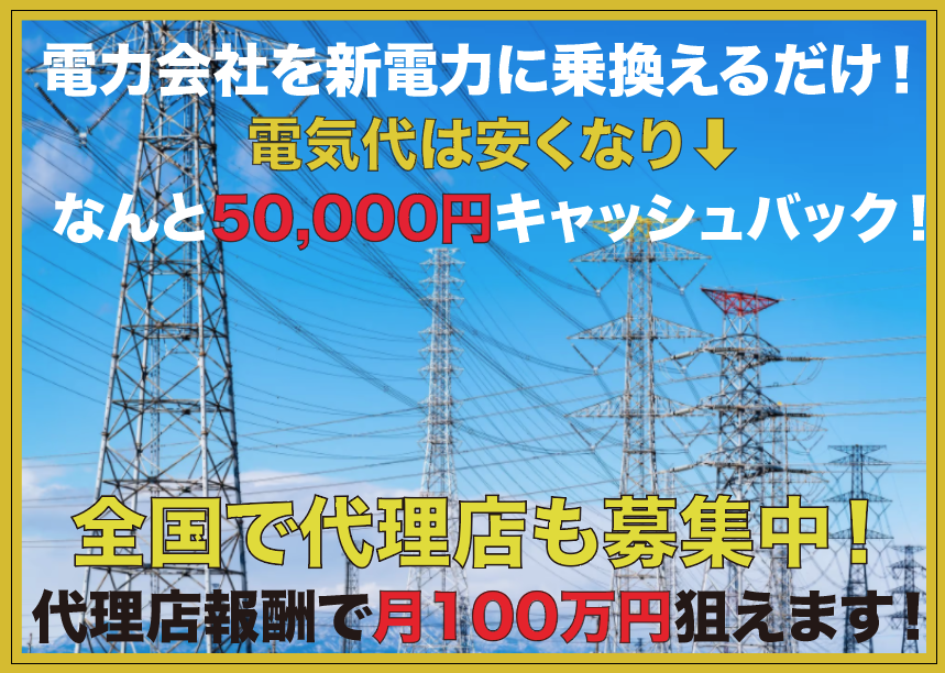 現在の電力会社から新電力に乗り換えしていただくだけで電気代が安くなりキャッシュバックが50,000円貰えるキャンペーンです!