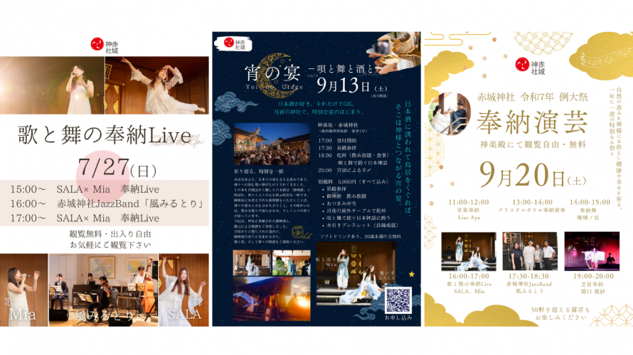 私はこれまで赤城神社で「歌と舞の奉納Live」「宵の宴」を開催し、例大祭で舞姫として巫女舞を経験させていただきました。