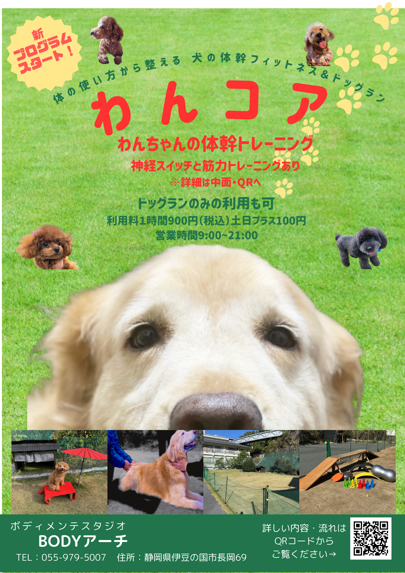 わんコアは、家族であるわんちゃんの将来の健康づくりをするプログラムです。人間の機能的トレーニングのプロとドッグトレーナーのコラボで生まれた新メソッドです。家の中で過ごすことが多いわんちゃんたちは体幹が弱くなり、関節炎や生活習慣病になることで飼い主よりも早く年をとって体調不良や関節のトラブルをかけることが増えています。もともとの機能をとりもどすことで 体軸を強くして 身体の歪みや不調を改善しています。