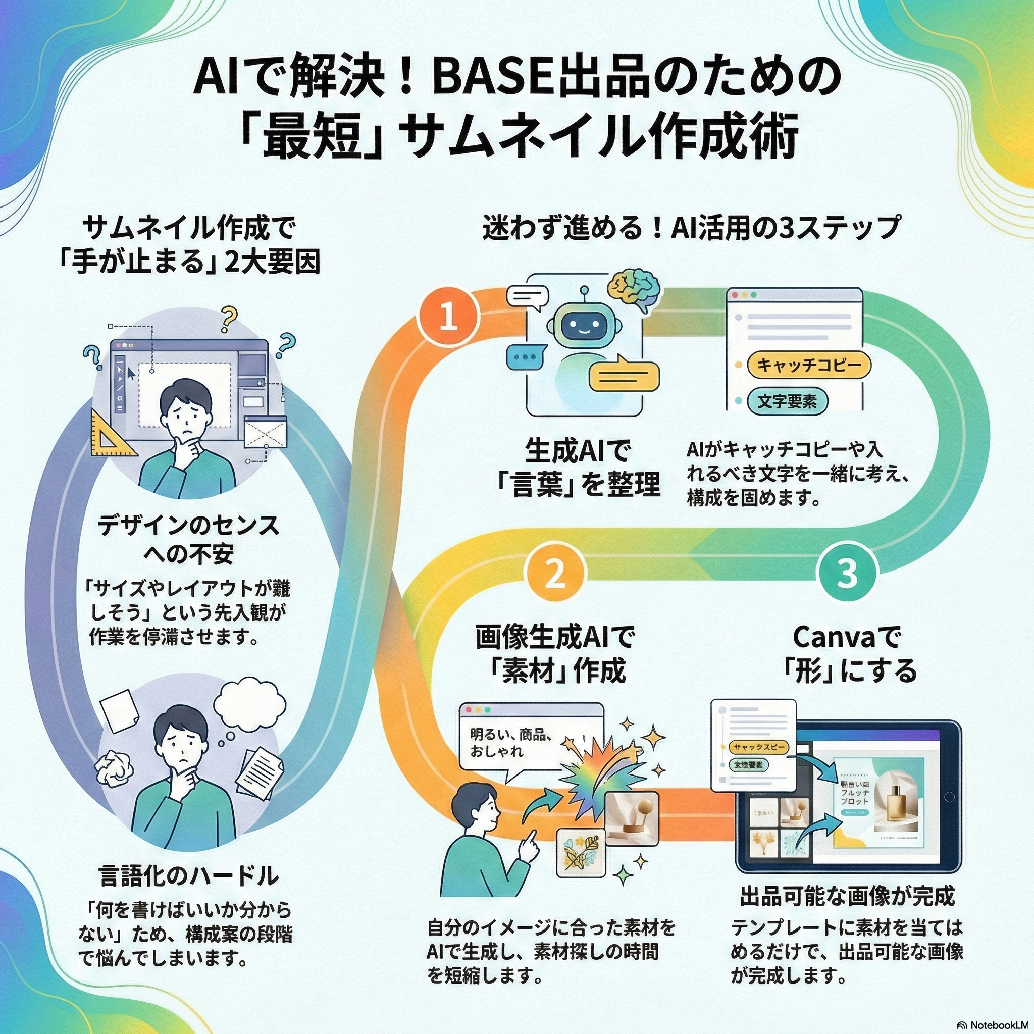 この講座は、BASE(LINK BASE)に商品やサービスを掲載したいけれど、「サムネイル画像が作れずに止まってしまう」「画像のことを考えると出品作業が進まない」という方のための、サムネイル作成に特化した実践講座です。
