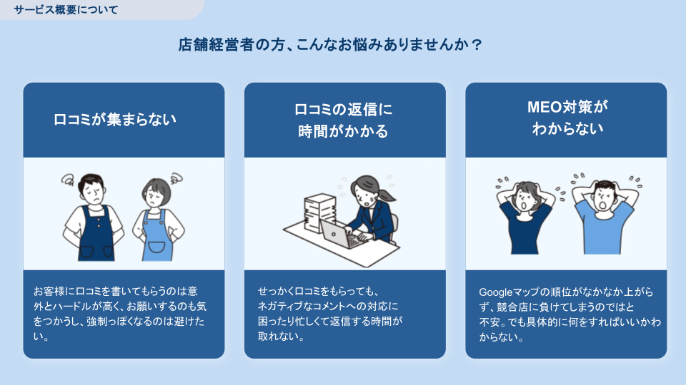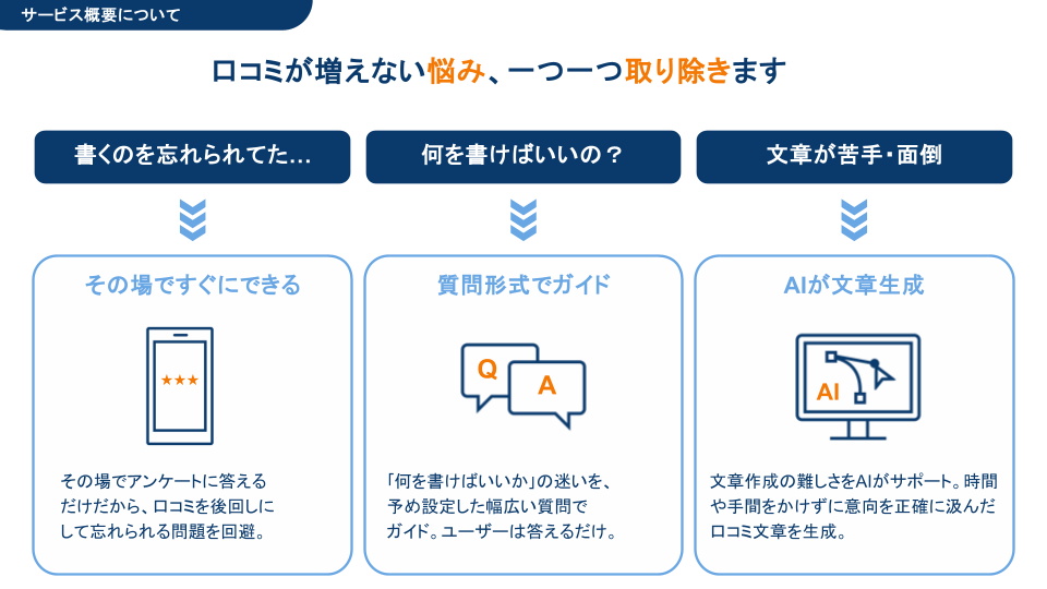 AI口コミ支援ツール導入: 最新AIが口コミの獲得から返信までを強力サポート。放置されがちな口コミを資産に変えます。